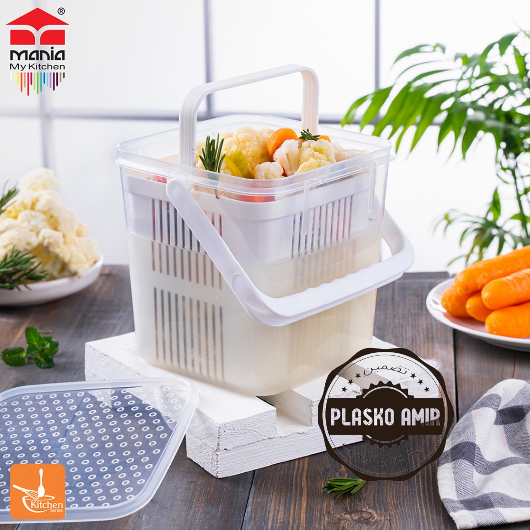 ظرف نگهدارنده ترشی و لبنیات مانیا یک وسیله کاربردی از پلاستیک بدون مواد مضر ساخته شده و به منظور جدا کردن آب از مواد غذایی، سبدی متحرک دارد که در هنگام استفاده از آن به واسطه یک گیره S شکل در سطحی بالاتر قرار میگیرد و به لبه مخزن اصلی متصل می شود تا امکان دسترسی آسان به مواد داخل ظرف را فراهم شود.