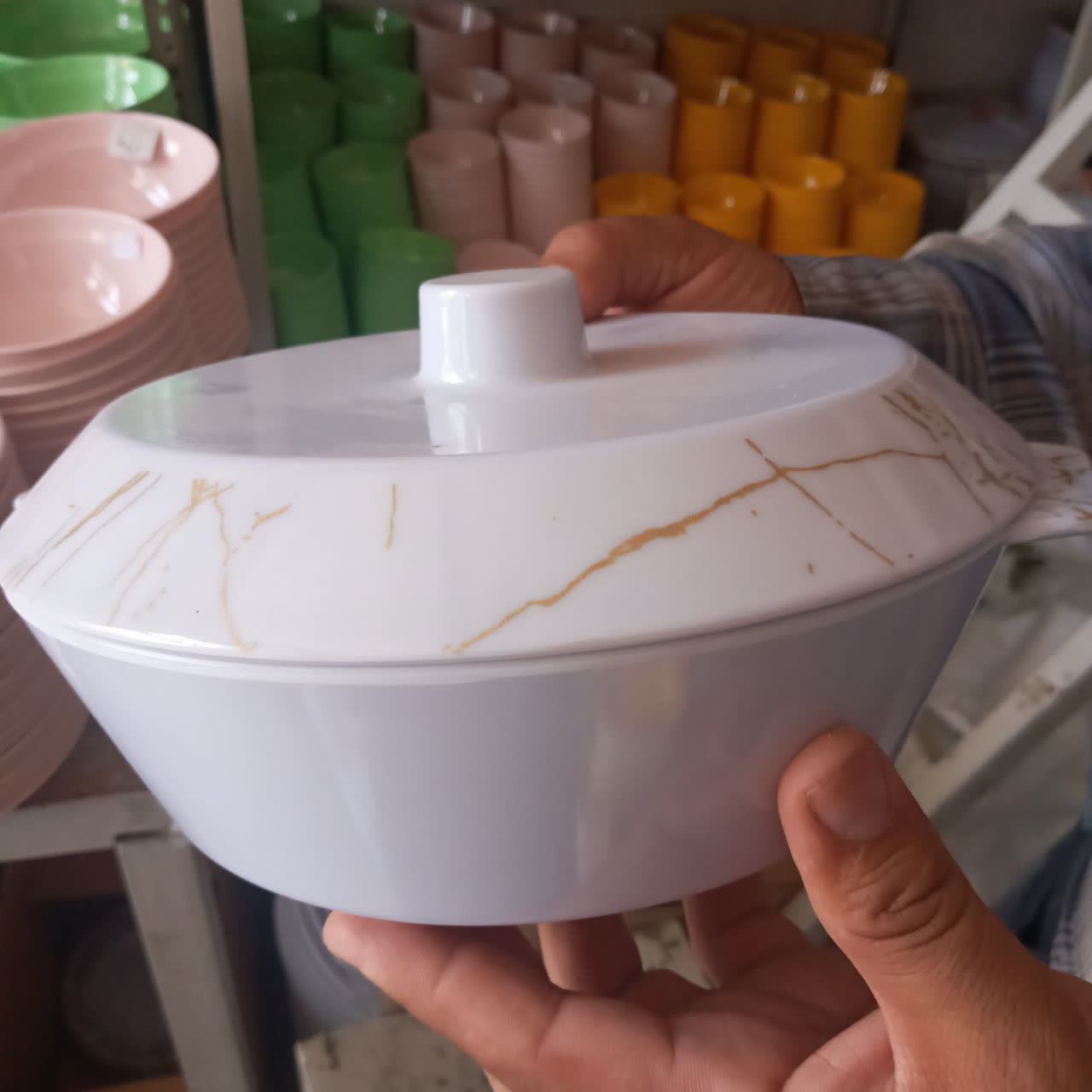 سوپ خوری ملامین رنگی درب دار بزرگ مارک یزد گل طرح ماربل مبلمونسرا مدل 277071