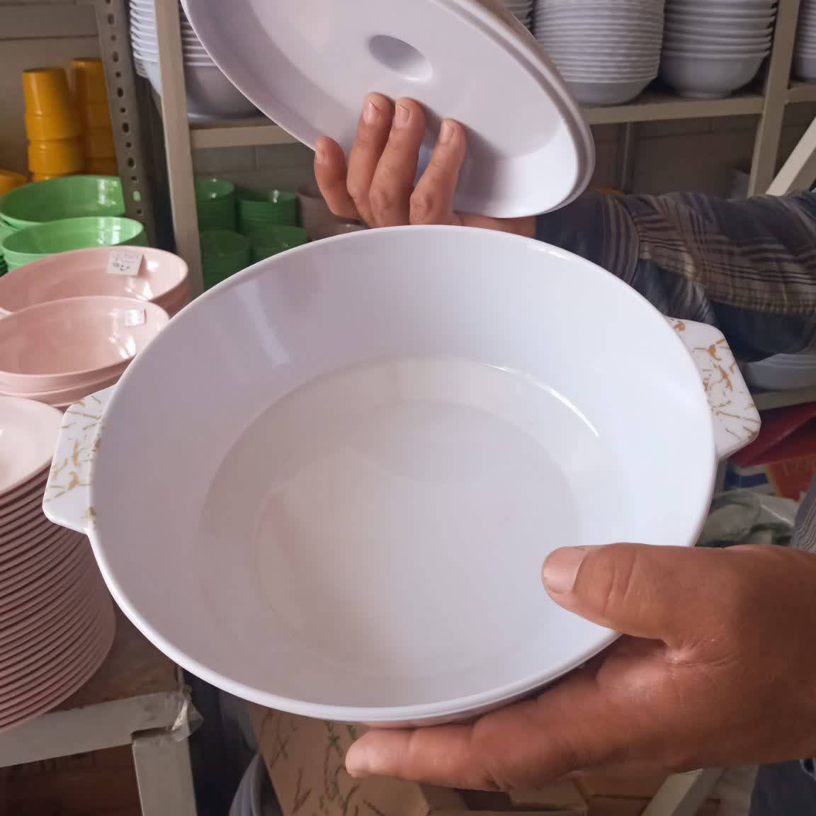 سوپ خوری ملامین درب دار بزرگ سایز قطر ۲۲ در ارتفاع ۹ قابلمه درب دار ملامین دارای نشان استاندارد ملی ایران میباشد مواد درجه یک بهترین مارک معروف ایران جنس بسیار عالی تولید کارخانه یزد ملامین اصل یزد