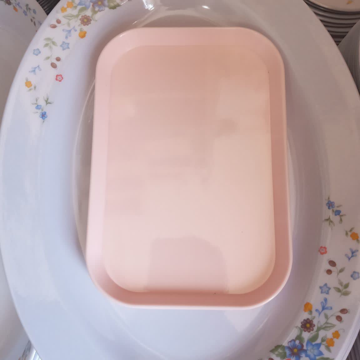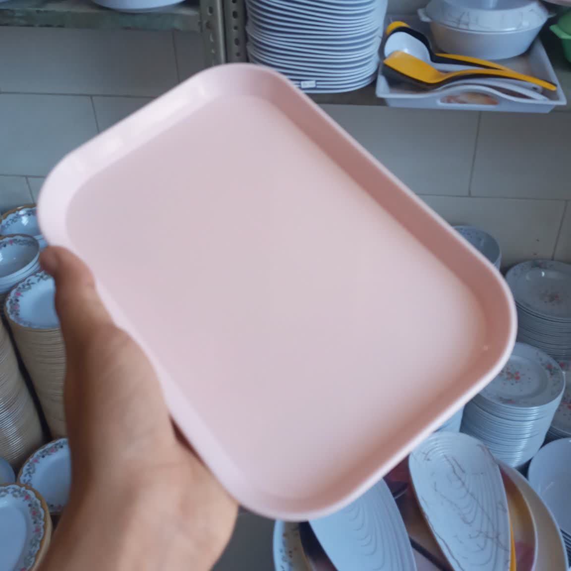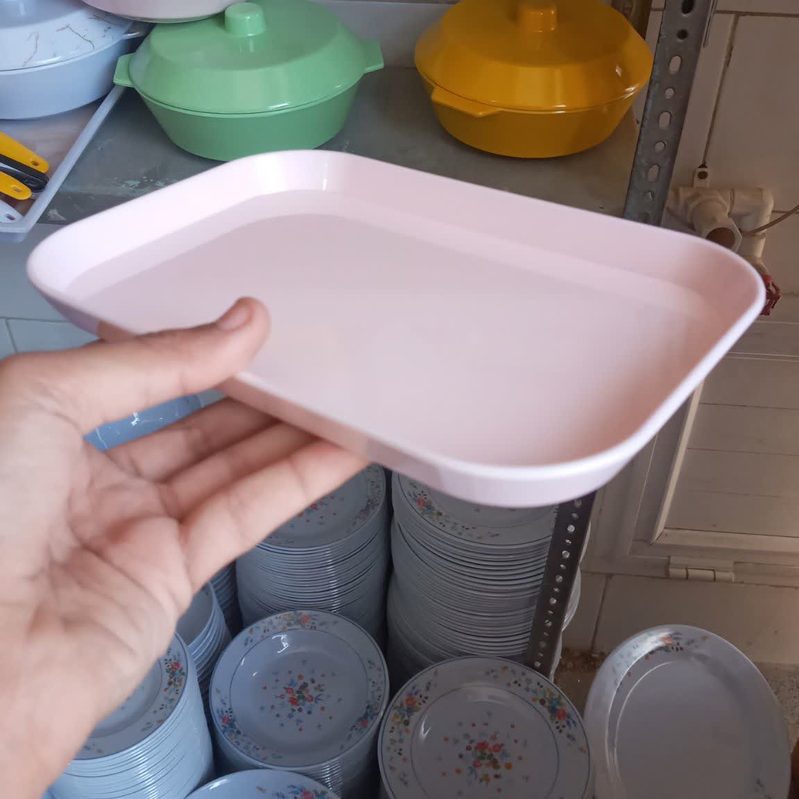 سینی ملامین رنگی مارک یزد گل دارای نشان استاندارد ملی ایران مواد درجه یک تولید در کارخانه یزد ابعاد ۱۴ در ۲۰ رنگ صورتی و زرد
