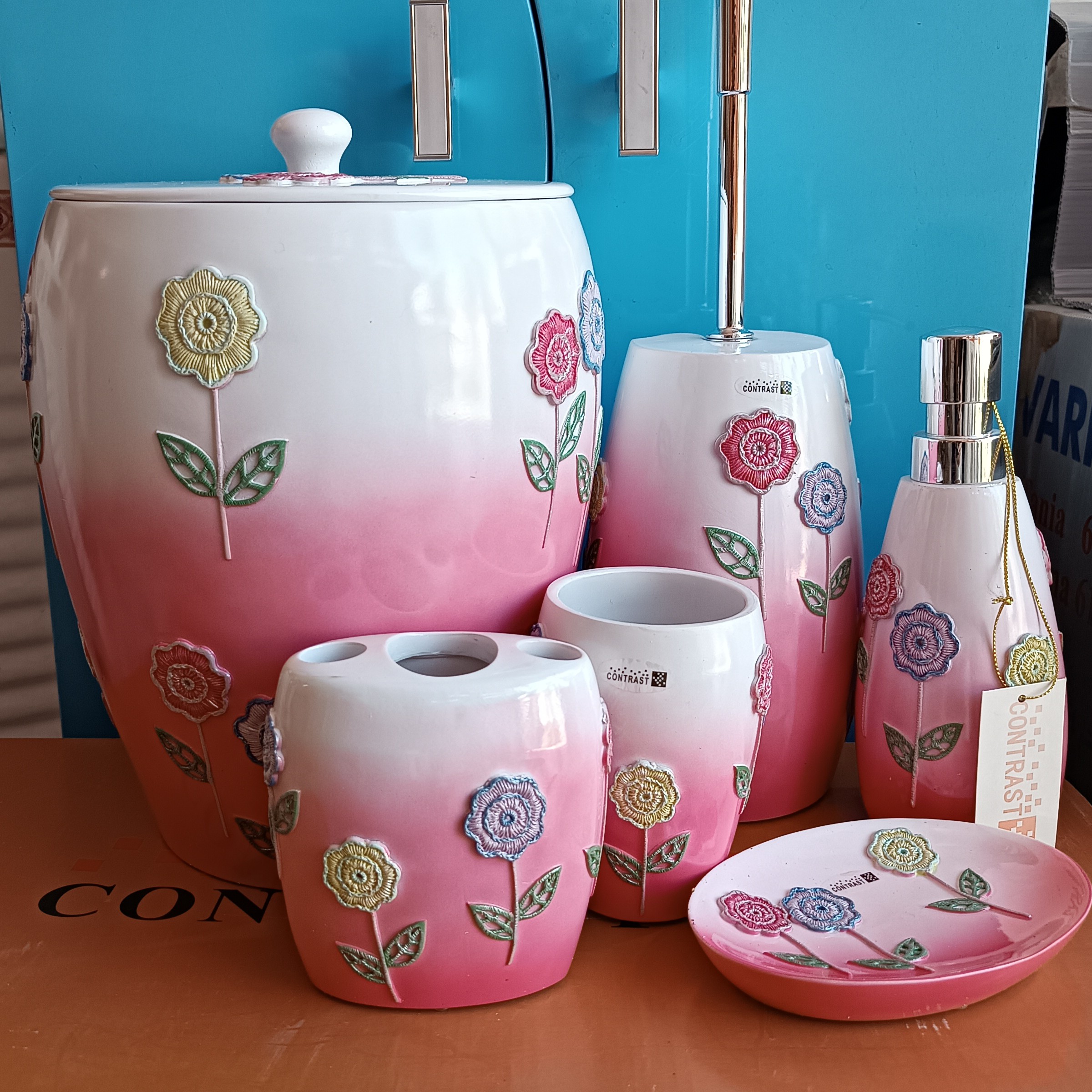 ست سرویس بهداشتی 6تکه کنتراست شامل سطل درب داربه ارتفاع2۵وقطر۱۹سانتیمتر،برس برشی،جامایع،جامسواک،لیوان وجاصابون می باشد.درقسمت تحتانی جامسواک وفرچه سوراخی جهت خروج آب تعبیه شده است.همچنین طراحی زیبا ،جنس مقاوم،قابلیت شستشو،ازخصوصیات متمایزاین محصول می باشد.شرکت کنتراست موفقیت خودراباتولیدمحصولات زیباوبادوام سرویس بهداشتی وحمام وآشپزخانه،برهمگان ثابت نموده است.این مجموعه برای بانوان باسلیقه علی الخصوص نوعروسان پیشنهادمی گردد.