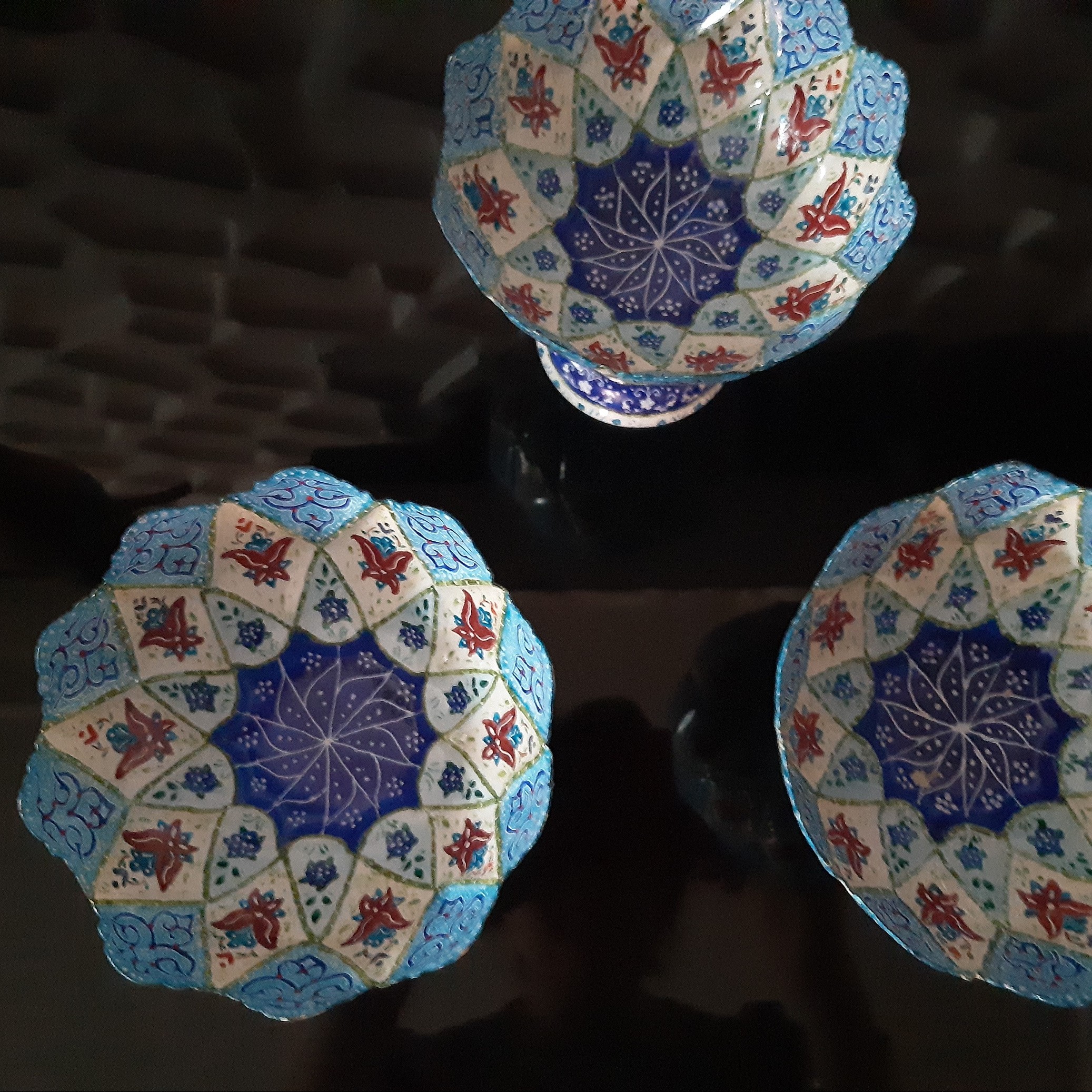 کاسه پایه دار میناکاری مسی با لعاب ضدخش وقابل شستشو وبسیار کاربردی باطراحی زیبا وظریف .قیمت هر عدد۰۰۰ ۳۷۰تومان میباشد