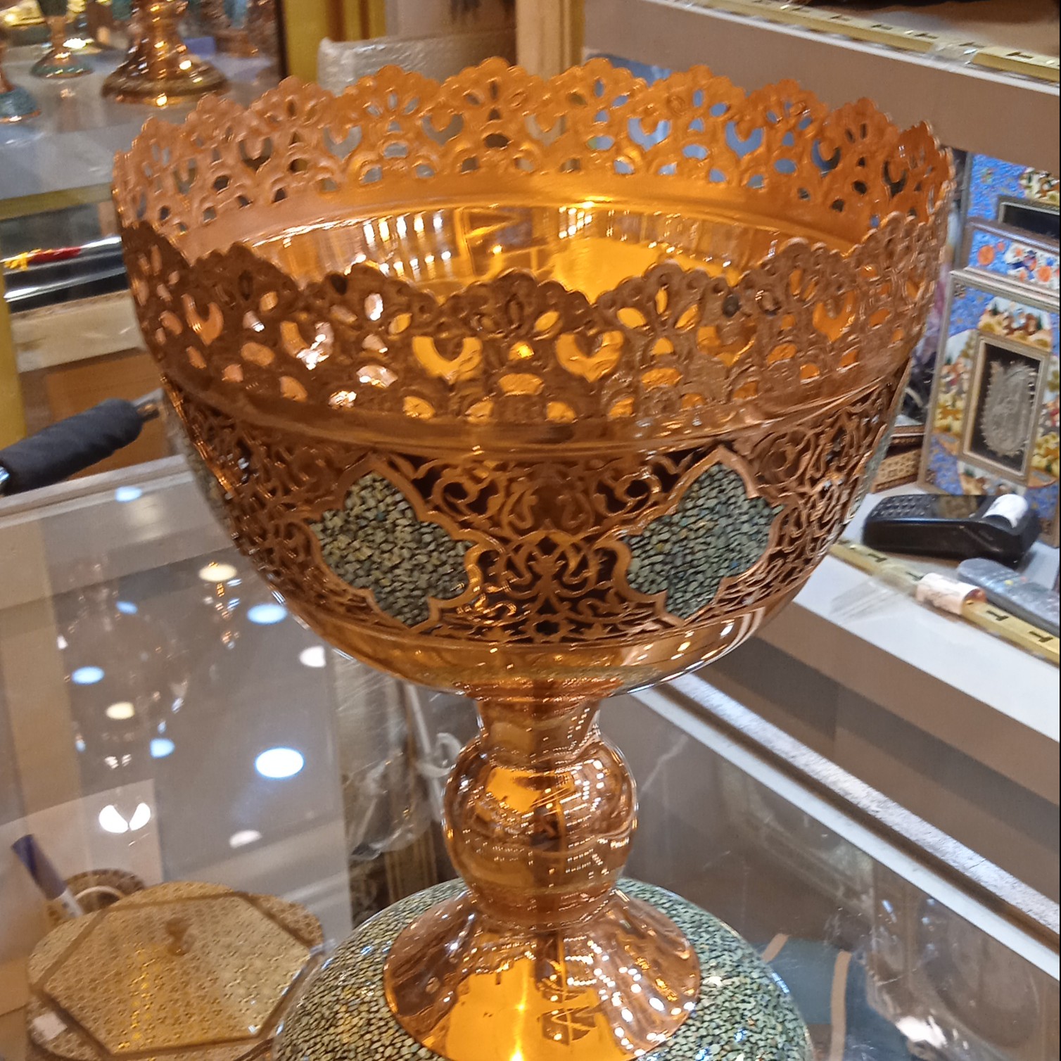 آجیل خوری پایه دار فیروزه مشبک کار استاد فیضیان پلی استر خورده رنگ ثابت