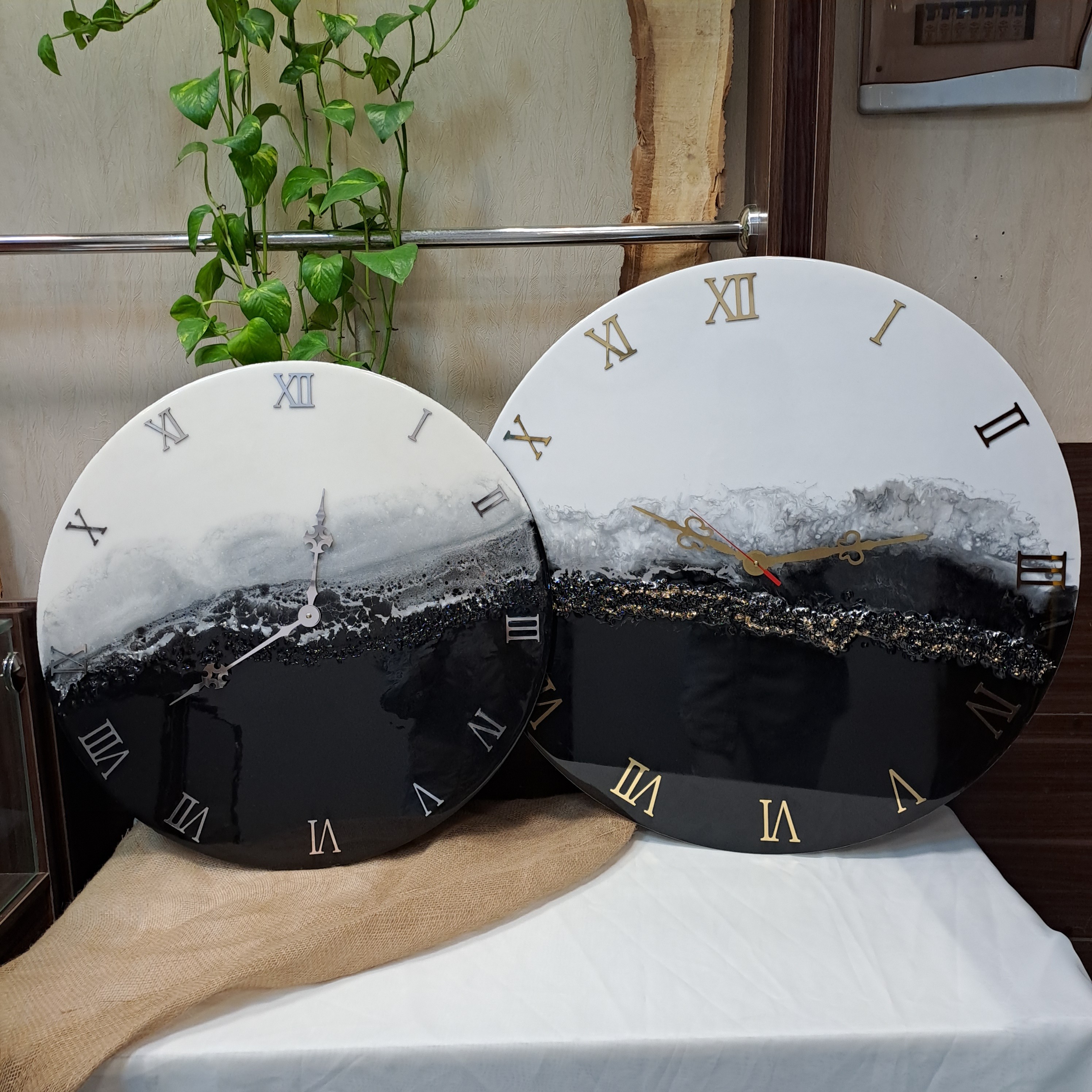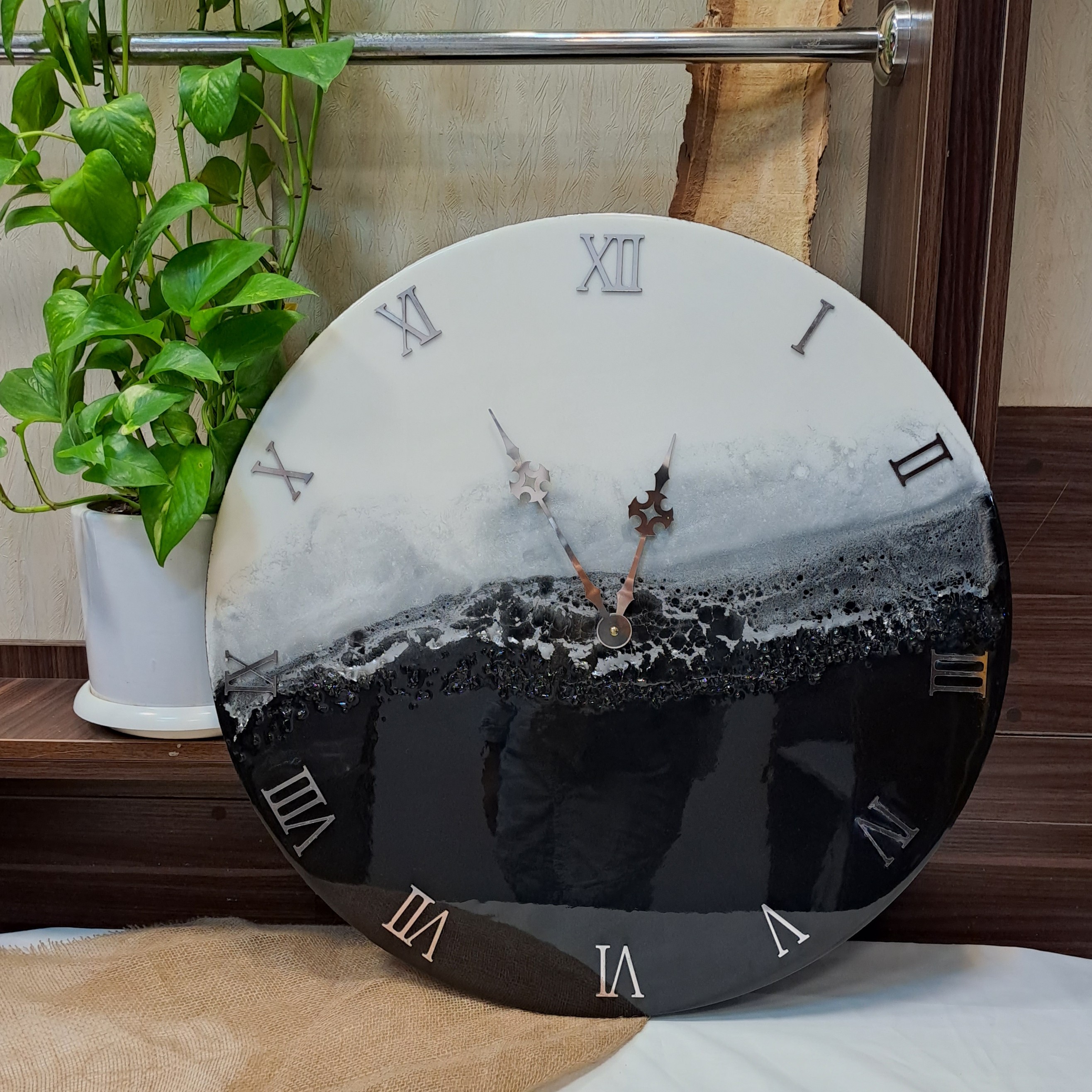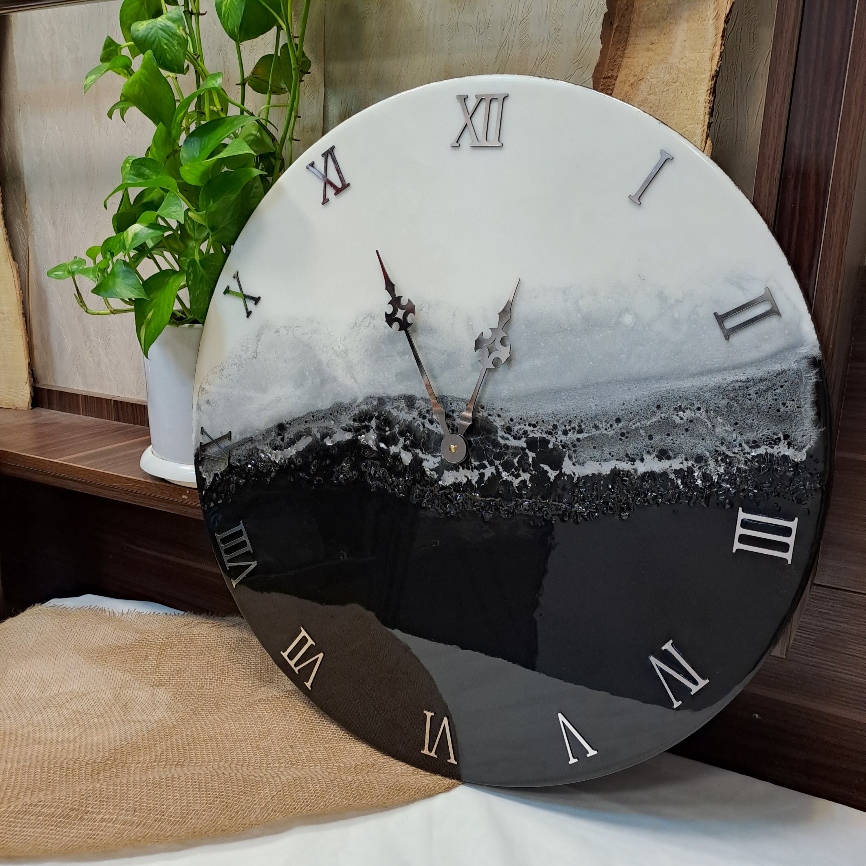 ساعت رزینی لوکس 60 سانت طرح روز و شب رنگ سفید مشکی نقره ای با تزئینات کریستال بسیار زیبا و مناسب جهیزیه مبلمونسرا مدل 238828