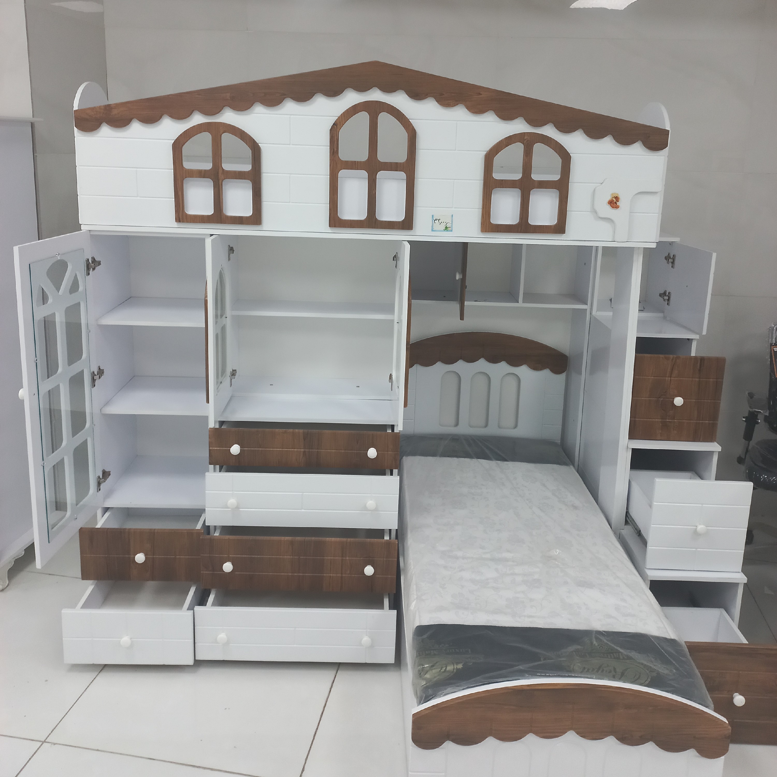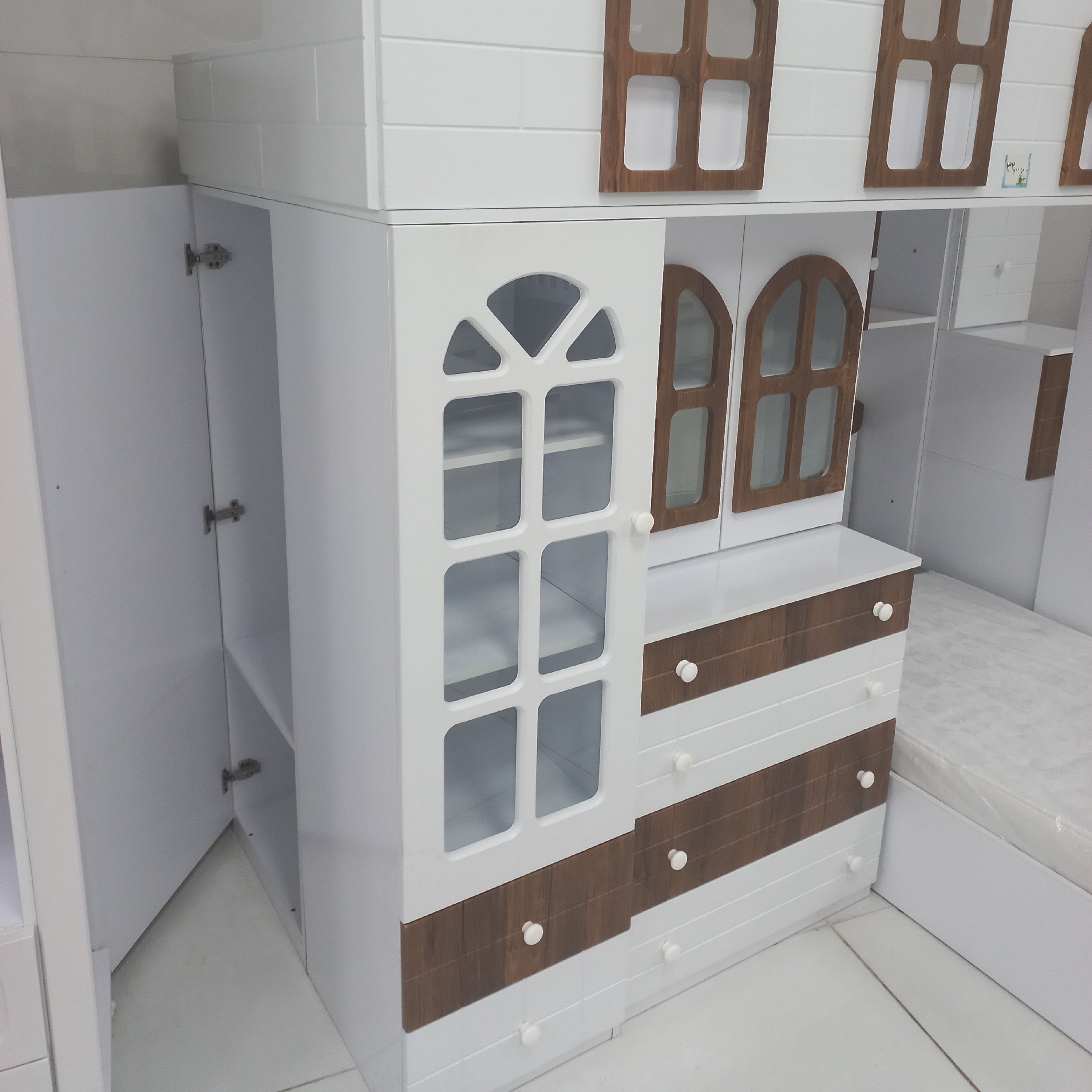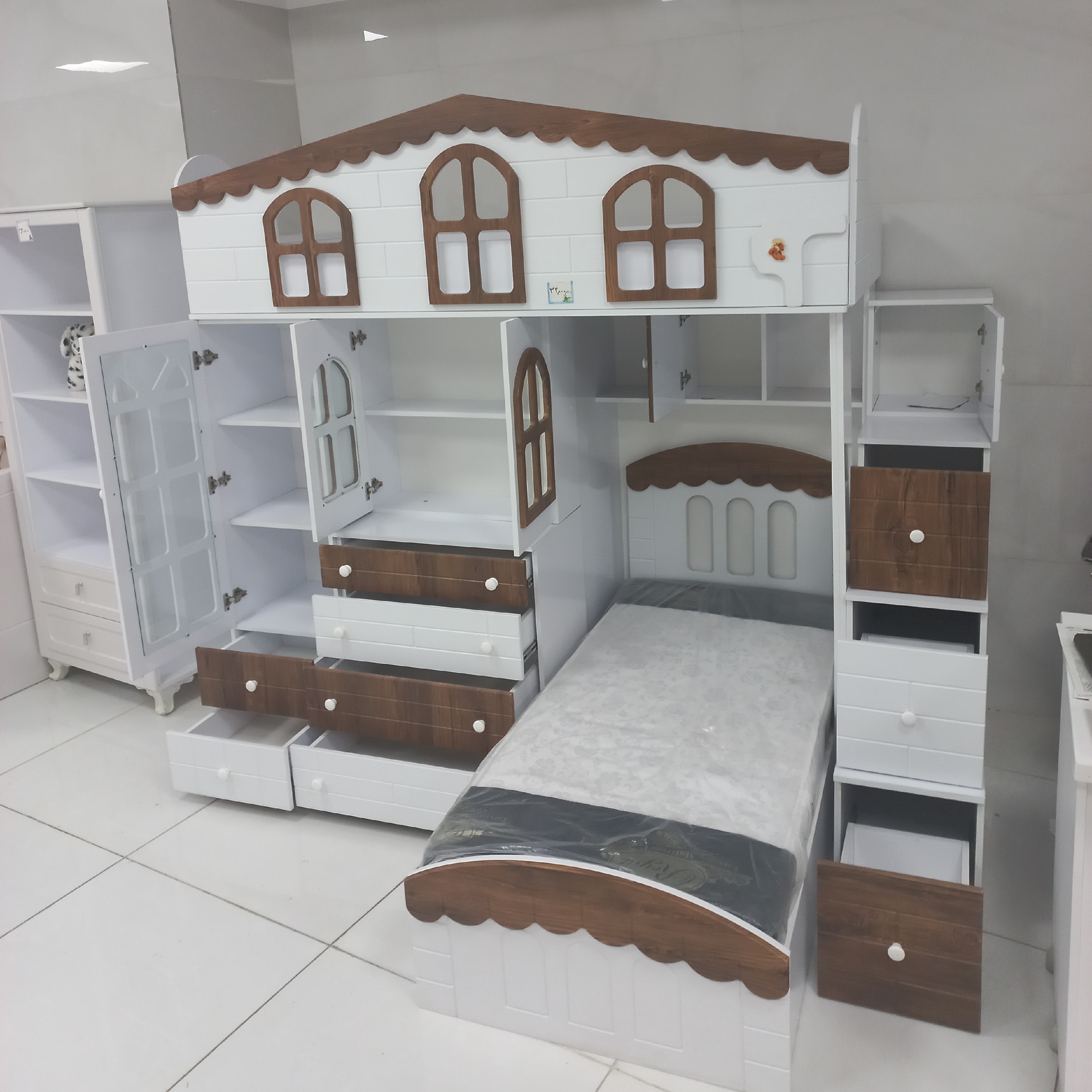 تخت دو طبقه ام دی اف و روکش ممبران درجه یک کره ای شامل میز تحریر یا میز آرایش همراه با۴ کشاب، ویترین و دوکشاب و کمد لباسی ،و پله ها هم کشاب هستن ، تخت بالا بزرگسال ابعاد ۹۰×۲متر و تخت پایین ۸۰×۱۸۰ مترتحمل وزن تا ۳۰۰ کیلو گرم