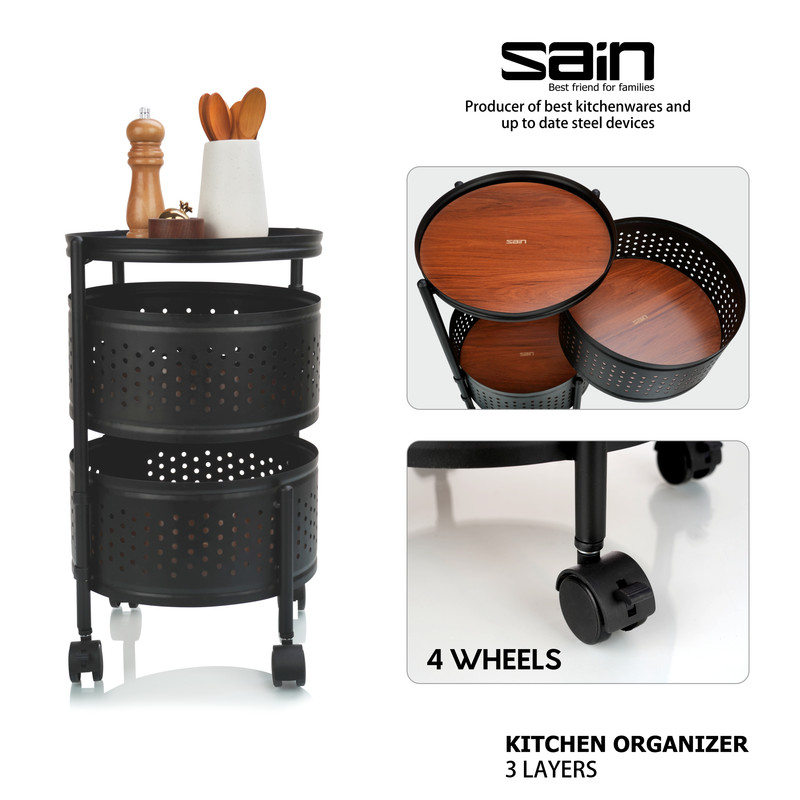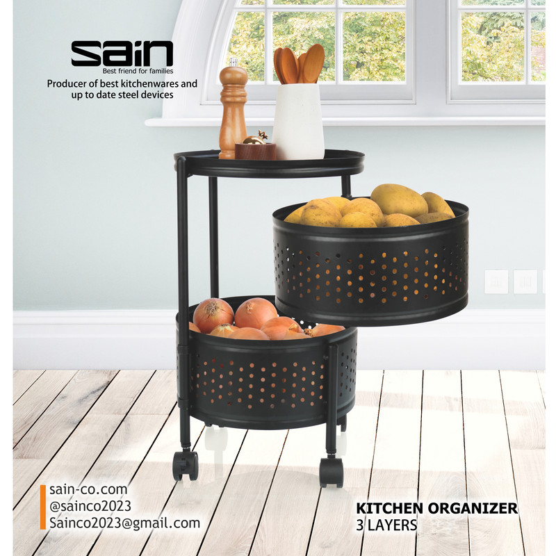 سبد سیب زمینی و پیاز دو طبقه ساین از جنس فلز آهن بوده و روکش آن می باشد. دارای یک طبقه ثابت و یک طبقه گردان است. بر روی طبقه بالا این سبد، یک سینی نصب شده که می توان آن را به عن مکانی برای تزئین در آشپزخانه خود قرار داد. علاوه بر آن می توان آن را با خیال راحت در فضای باز گذاشت، چون با توجه به طراحی عالی، کاملا از باران و برف در امان است. در کف این طبقات یک تخته قرار گرفته است که هر طبقه به راحتی قابل جدا شدن است و راحت می توان آن را تمیز کرد. حتی در صورتی که بعد از مدتی از رنگ آن خسته شدید و یا می خواهید متناسب با دیزاین منزلتان باشد، با یک اسپری رنگ می توان رنگش را به رنگ مورد علاقه خود تغییر دهید.