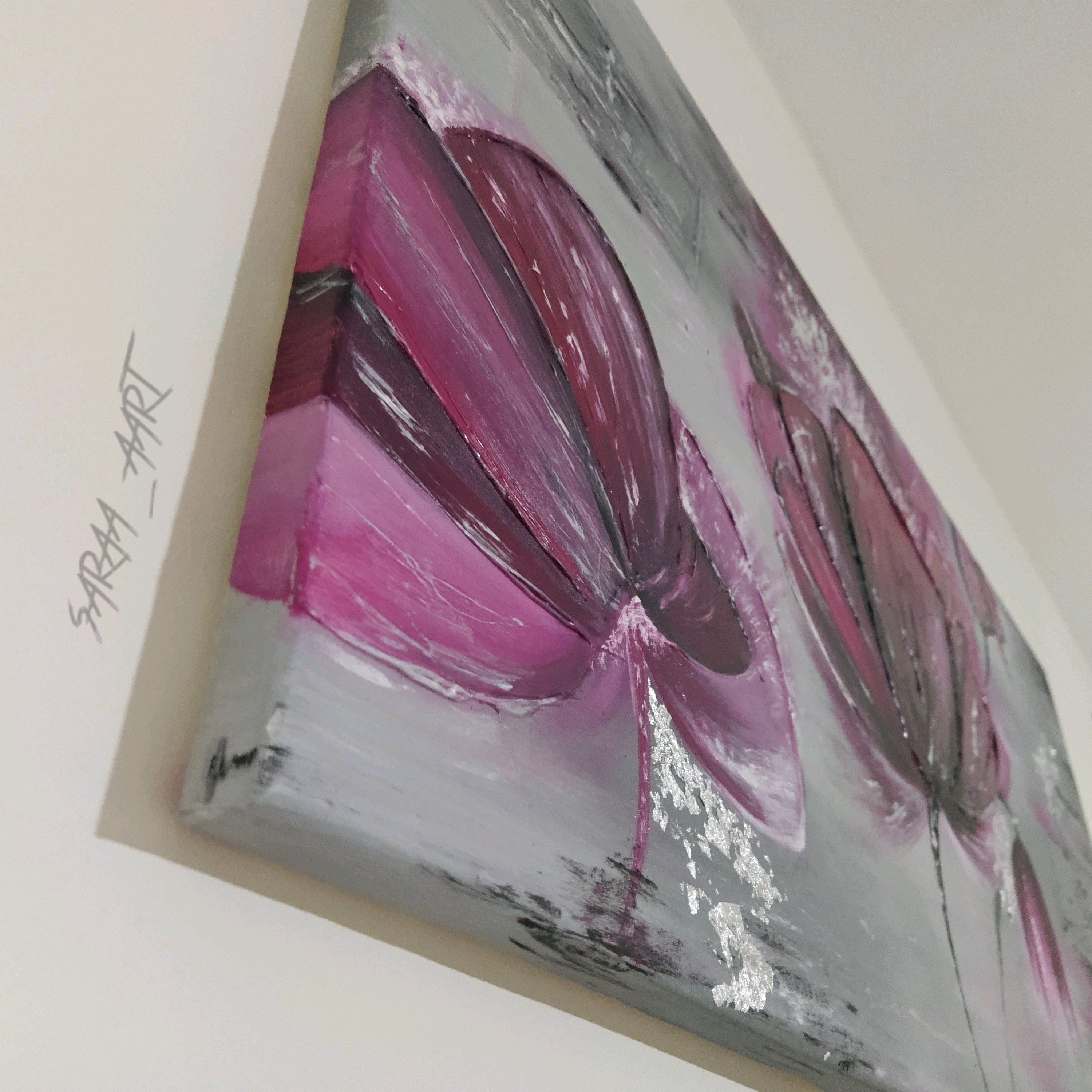 با اکرولیک کار شده رنگ صورتی و بادمجونی و طوسی نقره ای از ورق نقره استفاده شده کناره های بوم هم کارشده فیلم کار داخل اینستا هست ببینین تا متوجه زیباییش بشین برجسته ست سایز و رنگ قابل تغییره
