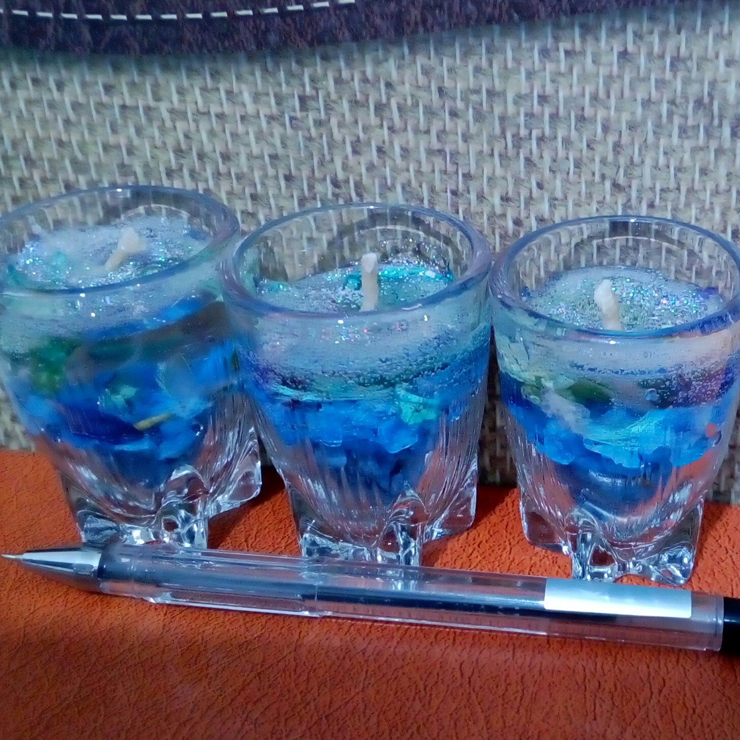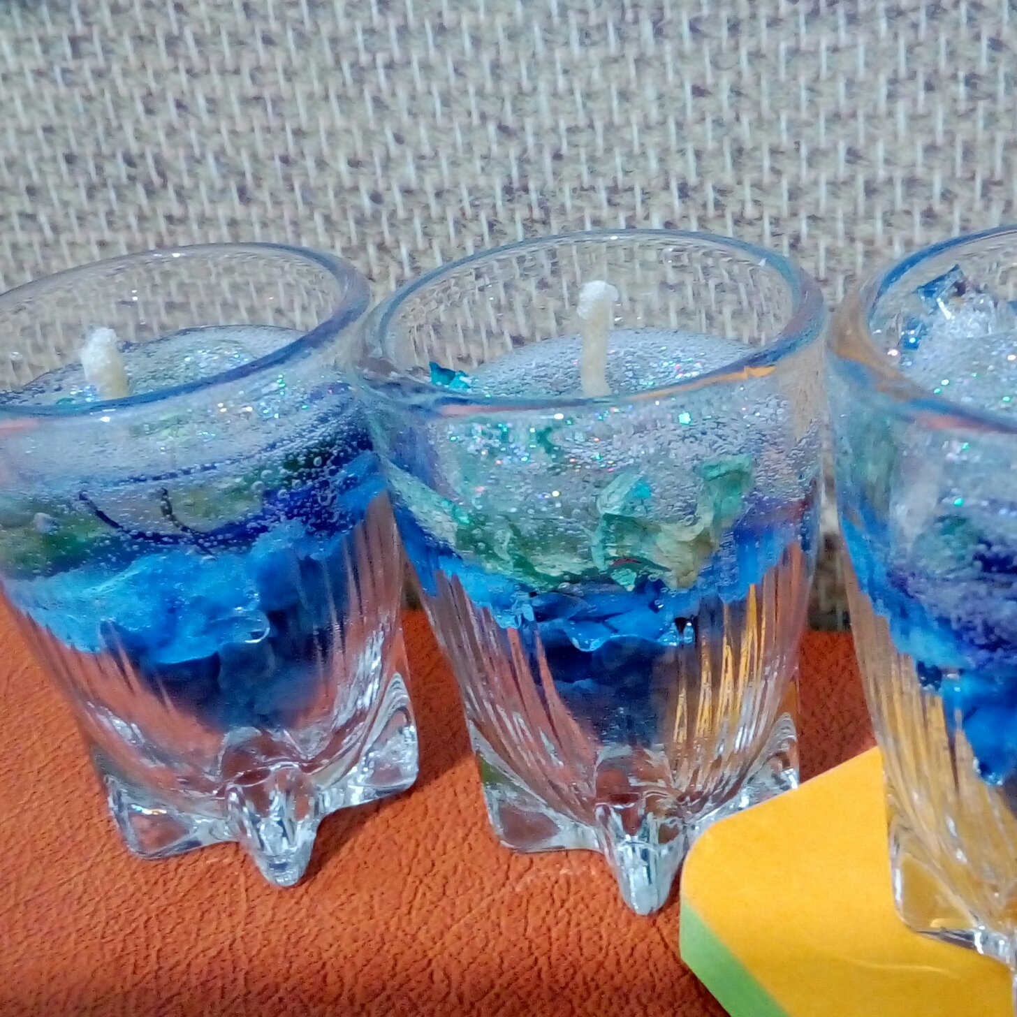شمع ژله ای در رنگهای آبی و سبز می باشد با انواع تزینات سنگ رنگی برگ گلبرگ خشک و سایر تزیینات طبیعی استفاده شده