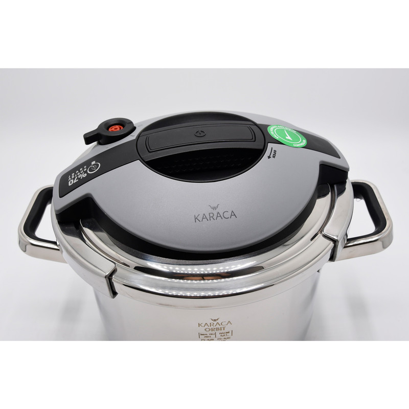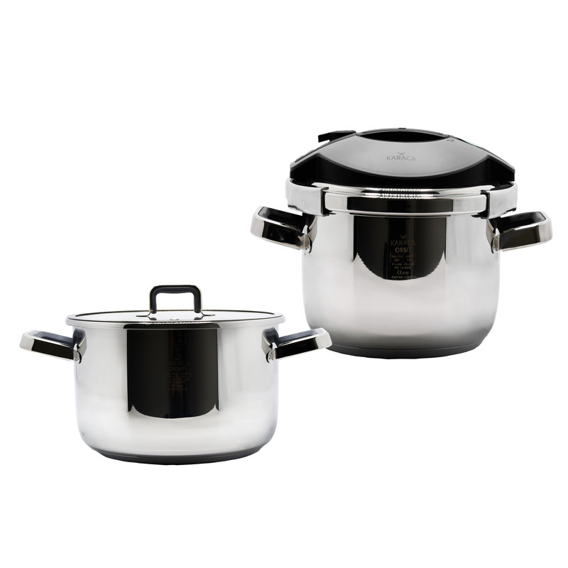 جدیدترین محصول کمپانی بزرگ KARACA ، ست دوقلوی زودپز، قابلمه و بخارپز مدل اوربیت، ساخت ترکیه است که این محصول با دو ظرفیت 6 و 4 لیتری امکان پخت همزمان دو نوع غذا توسط زودپز و قابلمه در یک زمان را فراهم می کند . این محصول دارای دو درب ، یکی استیل برای زودپز و دیگری شیشه پیرکس که جهت استفاده به عنوان قابلمه طراحی شده است که درب های موجود به هر دو دیگ 4 و 6 لیتری قابل اتصال هستند. هنگامیکه فرصت اندکی برای آماده سازی غذا دارید این زودپز از طریق بدنه استیل 18/10 و با کیفیت استاندارد اروپایی ، با حرارتی یکنواخت در تمام قسمتها سریعترین غذا را با حفظ ارزشهای غذایی در اختیار شما قرار میدهد و با صرفه جویی در 70٪ انرژی و 50٪ زمان پخت غذا می توانید وعده های غذایی خود را به روشی سریع و خوشمزه بپزید. جنس دستگیرهها از نوع باکالیت طراحی شده که در مقابل حرارت مقاوم هستند تا در زمان پخت آسیبی به آنها وارد نشود. درب کلیپسی این زودپز با فشار یک دست به راحتی باز و بسته میشود و کار کردن با آن بسیار راحت است. کف کالا به دلیل قابلیت کپسولی بودن این مزیت را دارد که حرارت را به طور یک نواخت به تمام قسمت ها برساند .همچنین بر روی درب این محصول برنامه سه حالته پخت تعبیه شده است.