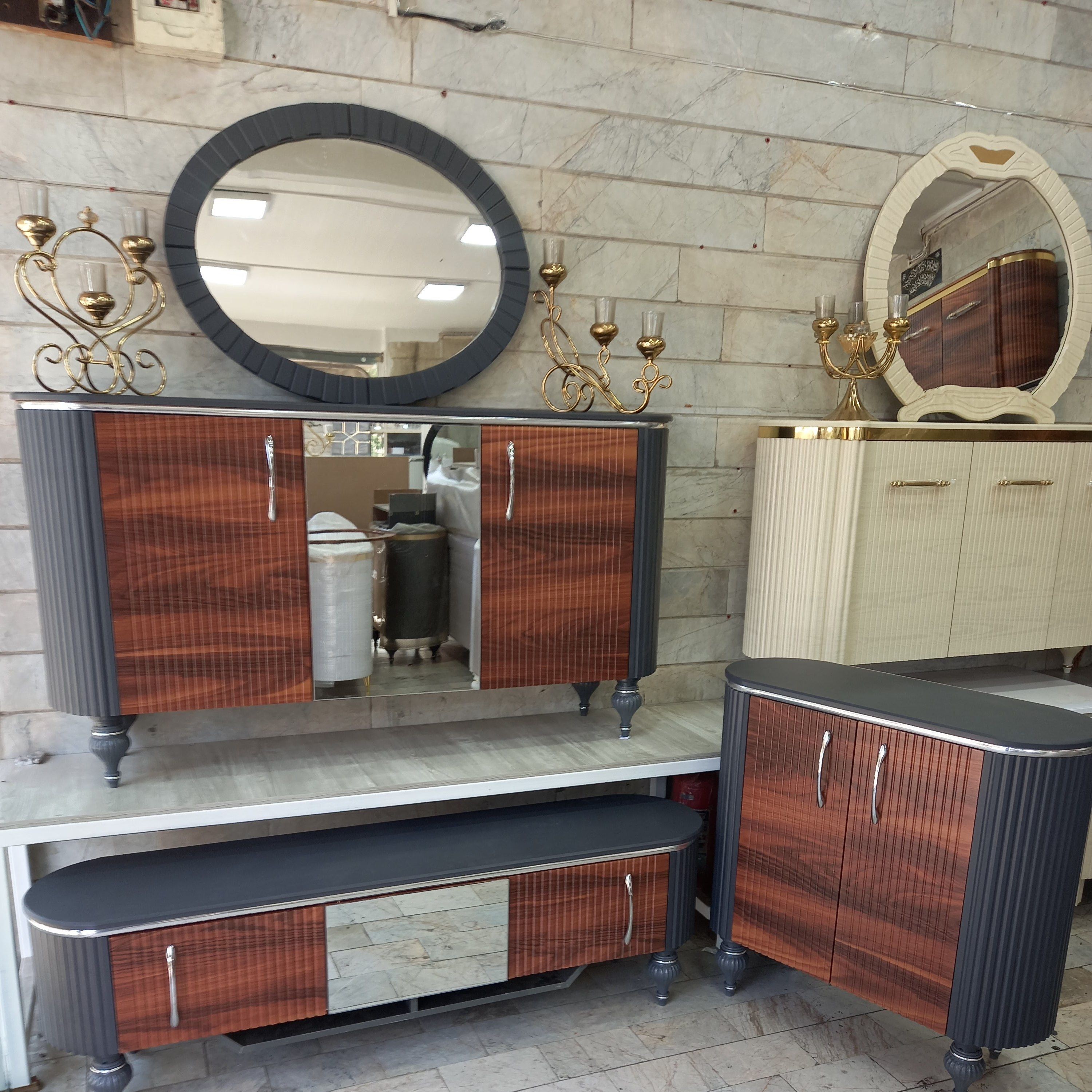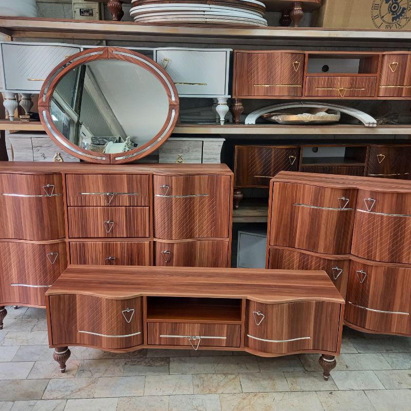 ست آینه کنسول میز تی وی جاکفشی جنس ام دی اف آینه دار و بدون آینه با رنگهای ترکیبی خاص پایه ها پلاستیک فشرده رنگ بندی دارد