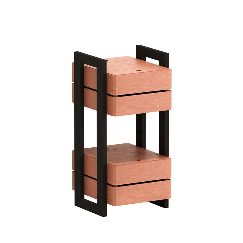 محصول از جنس چوب روس میباشد پایه های مشکی نیز چوبی است با رنگ مشکی بدنه قهوای از رنگ زد اب است پایه ها ثابت می باشد وزن کار خیلی کم میباشد سبد ها جا دار و بزرگ میباشد