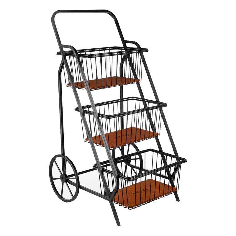 جا پیاز سیب زمینی 3 طبقه فلزی طرح کالسکه ای دارای اسکلت فلزی مشکی رنگ همراه با سه محفظه مستطیلی با کفه چوبی با دسته و پایه فلزی طرح چرخ مشکی این محصول قابل استفاده در لوازم آشپزخانه جهیزیه عروس بوده و مناسب استفاده در محیط آشپزخانه، آرایشگاه، خیاطی و … می باشد.