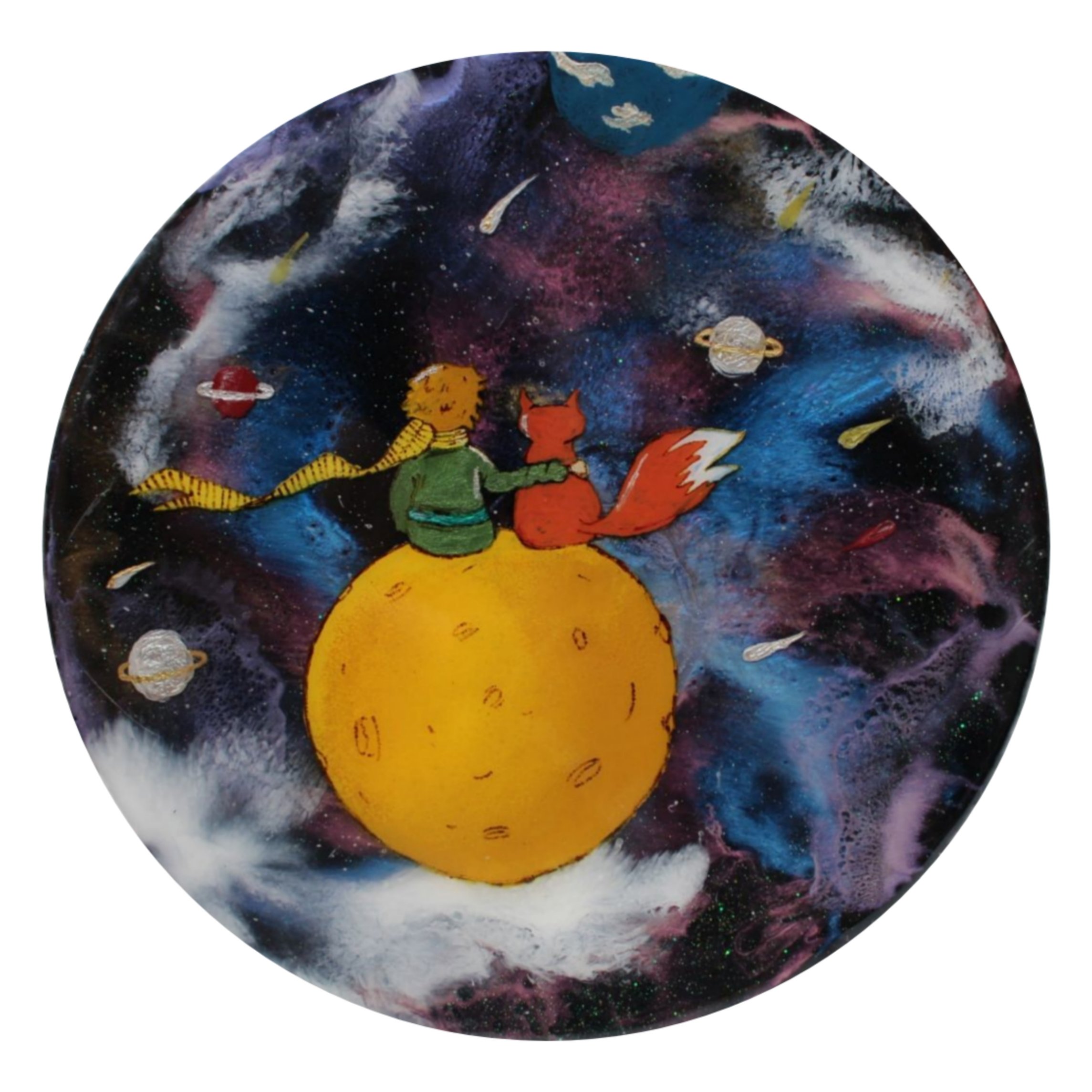 تابلو آبستره رزین زیبا تکنیک کهکشان کرومی کار شده و با نقاشی اکرلیک شازده کوچولو نقاشی شده و با رزین فیکس شده است