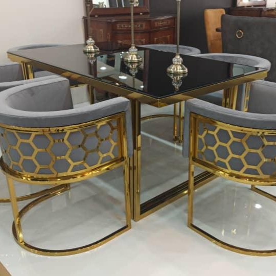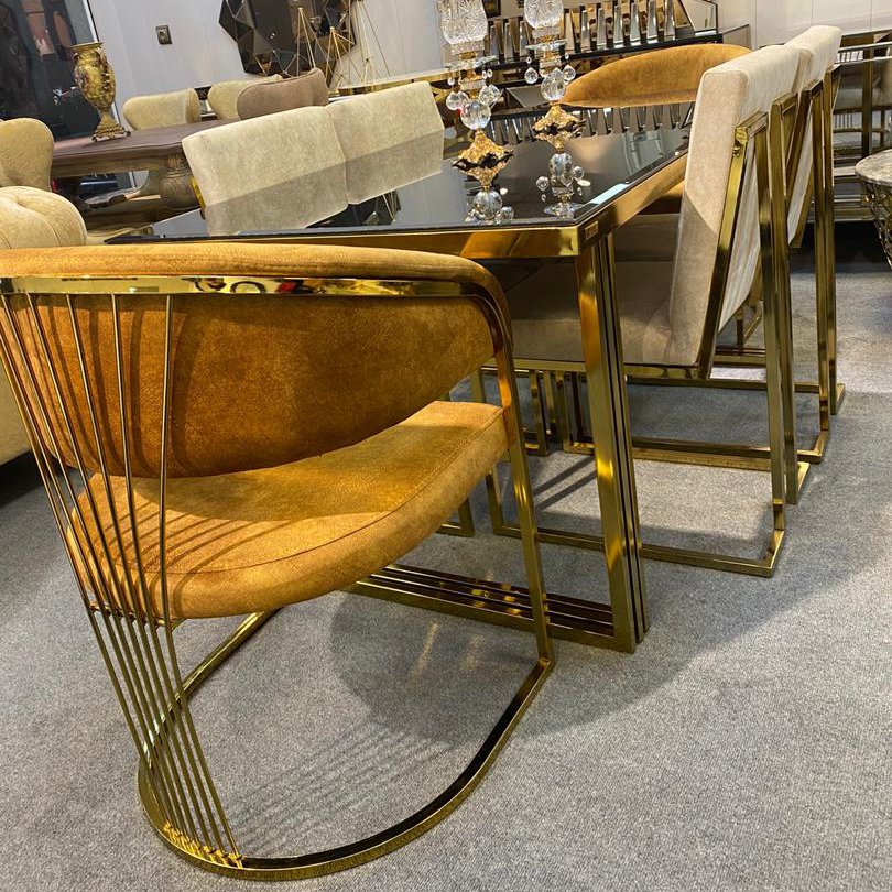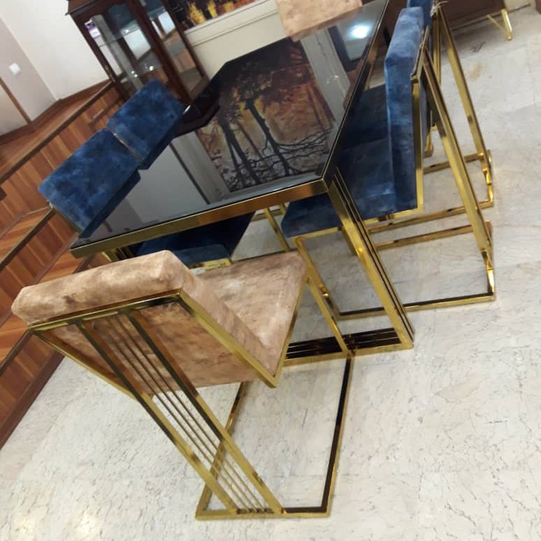 میز ناهارخوری استیل رنگ طلایی با صفحه شیشه سکوریت ابعاد میز 6نفره
