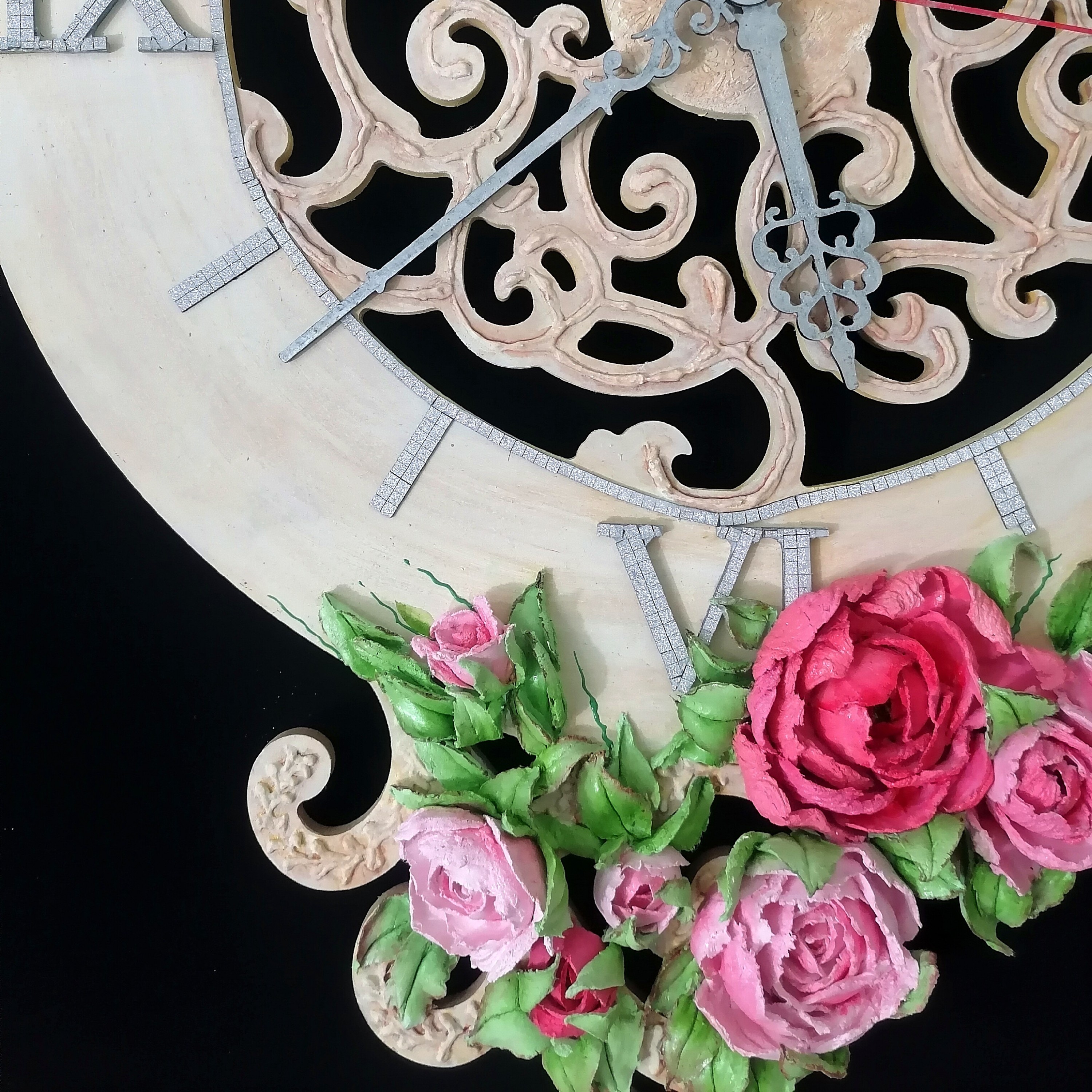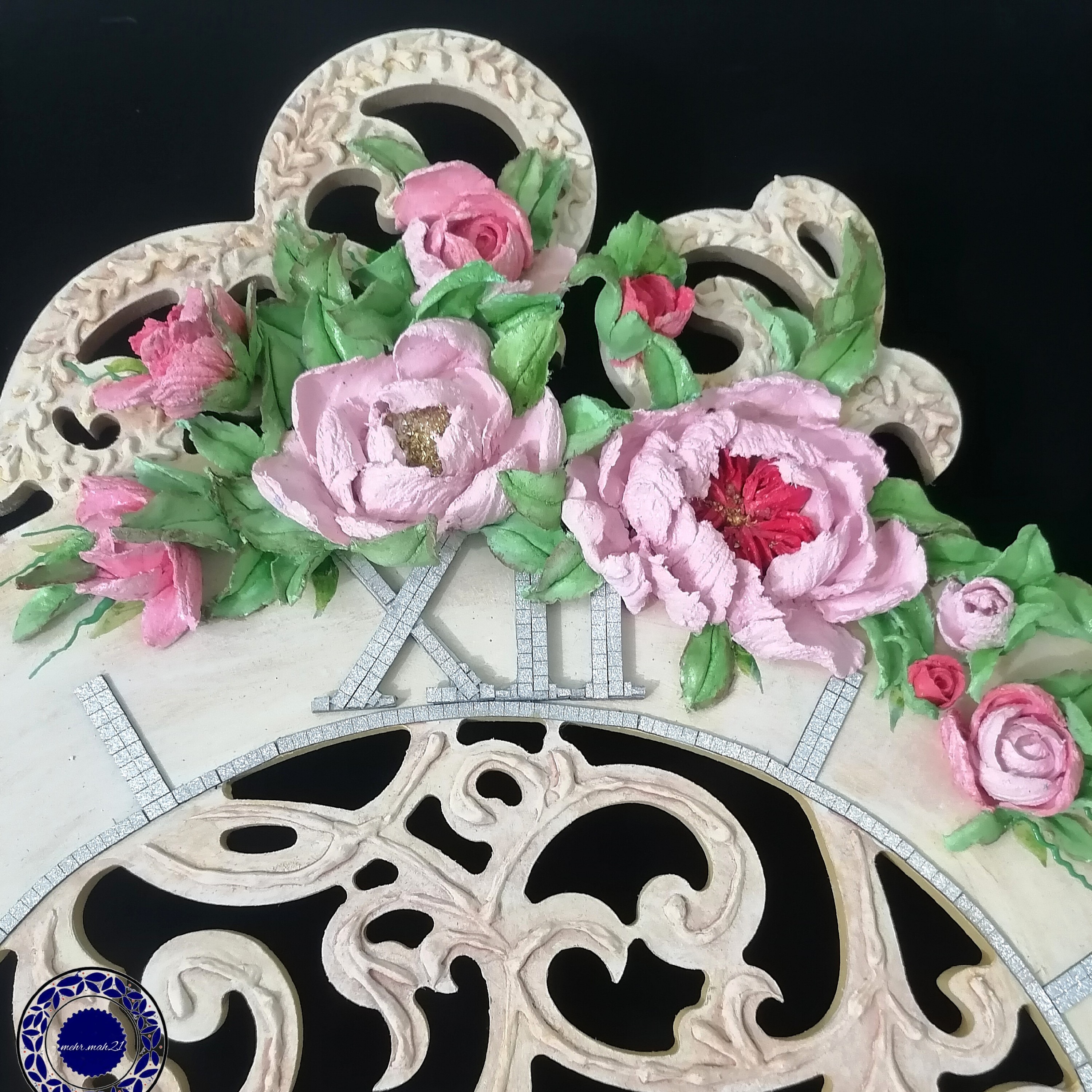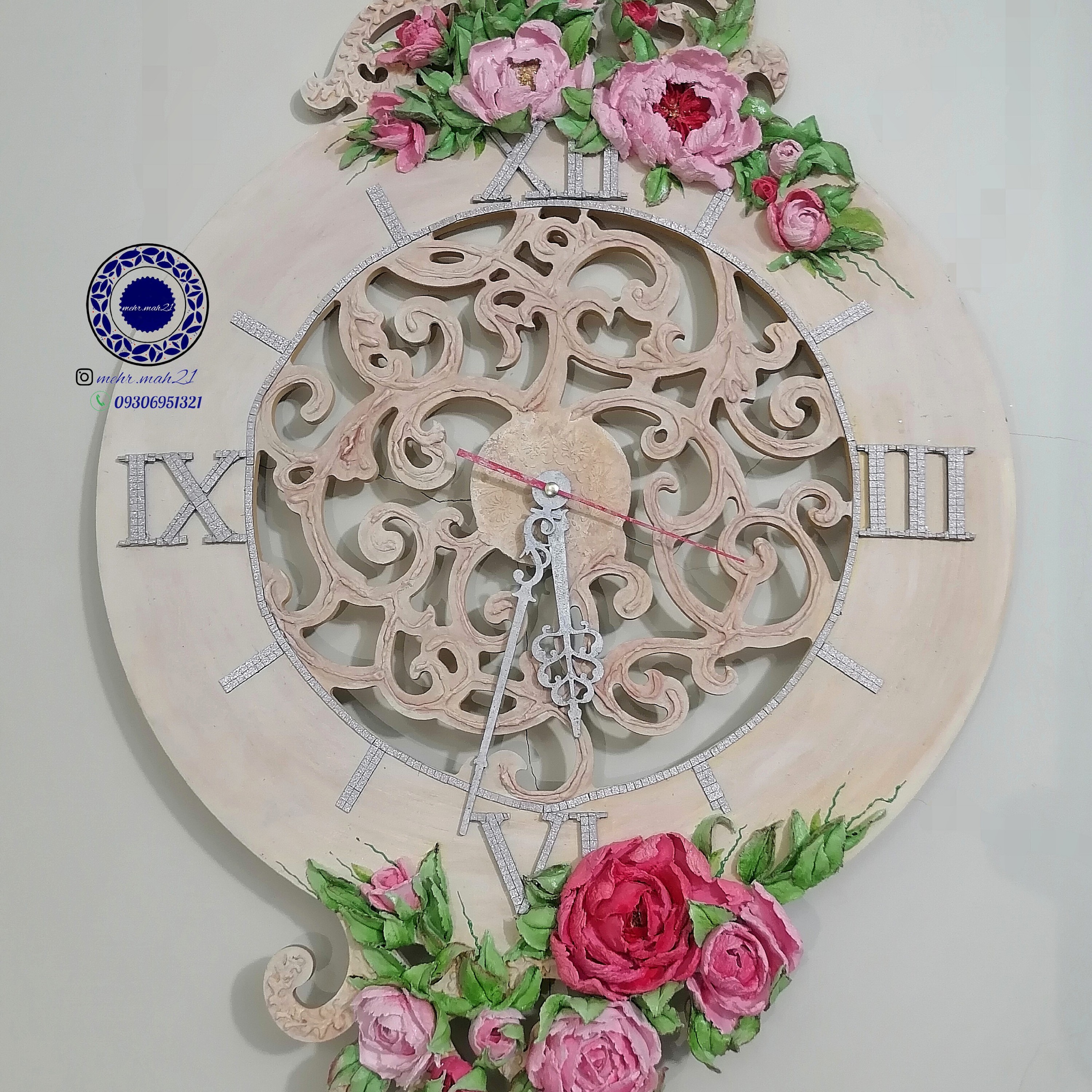 ساعت دیواری زمینه چوب گل های استاکو روسی اعداد رومی پتینه کاری شده مبلمونسرا مدل 240012