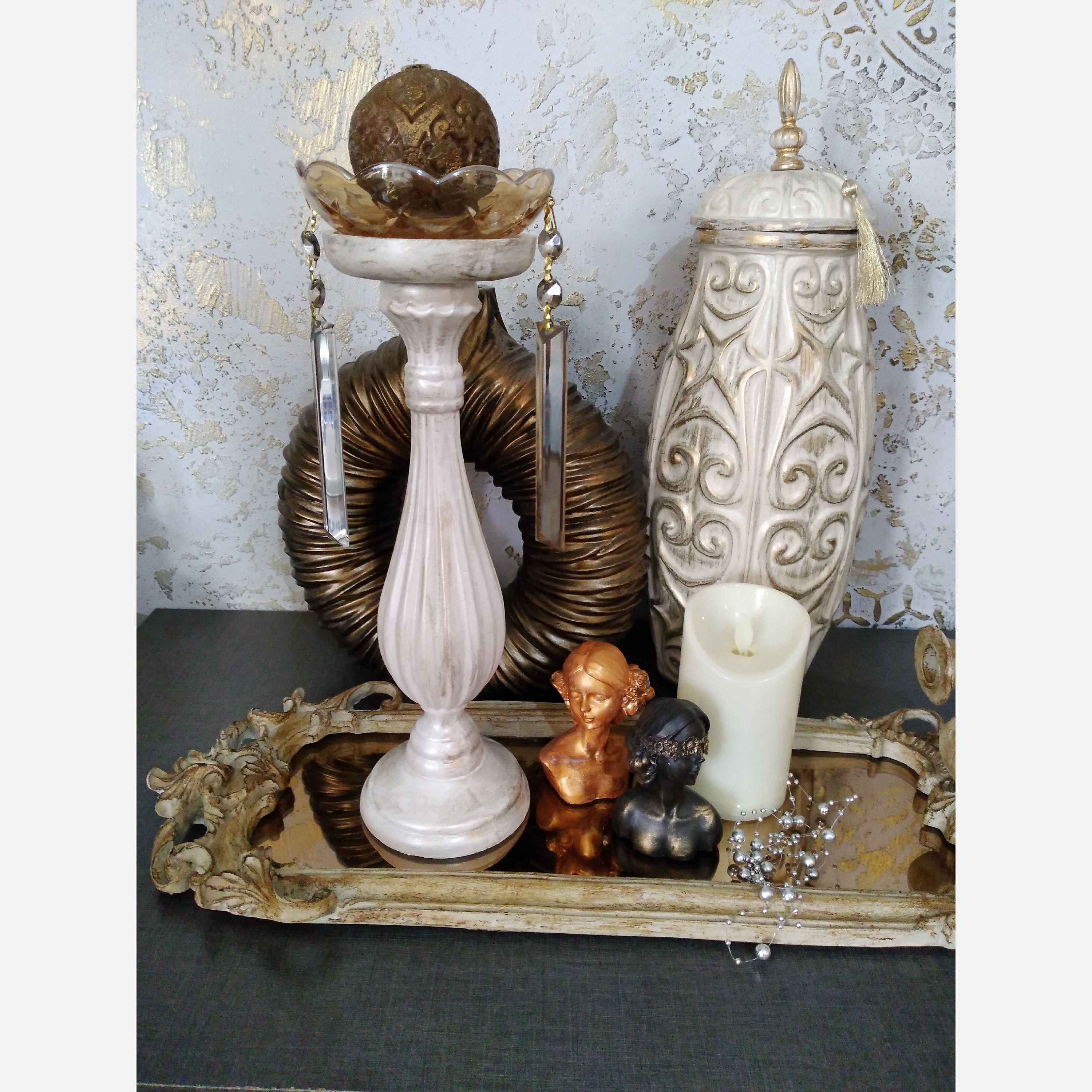 شمعدان تک پلی استر پتینه شده در هر رنگی قابل سفارشه .در عکس ها چند نمونه از رنگ های مختلف کار قابل مشاهده است محصول بصورت ست دو تایی یا چند تایی در هر رنگ و پتینه ای قابل سفارش میباشد در اسلایدها رنگ های متنوع اینکارپرفروش قابل مشاهده است زنبق و اویز هم قابل سفارشه