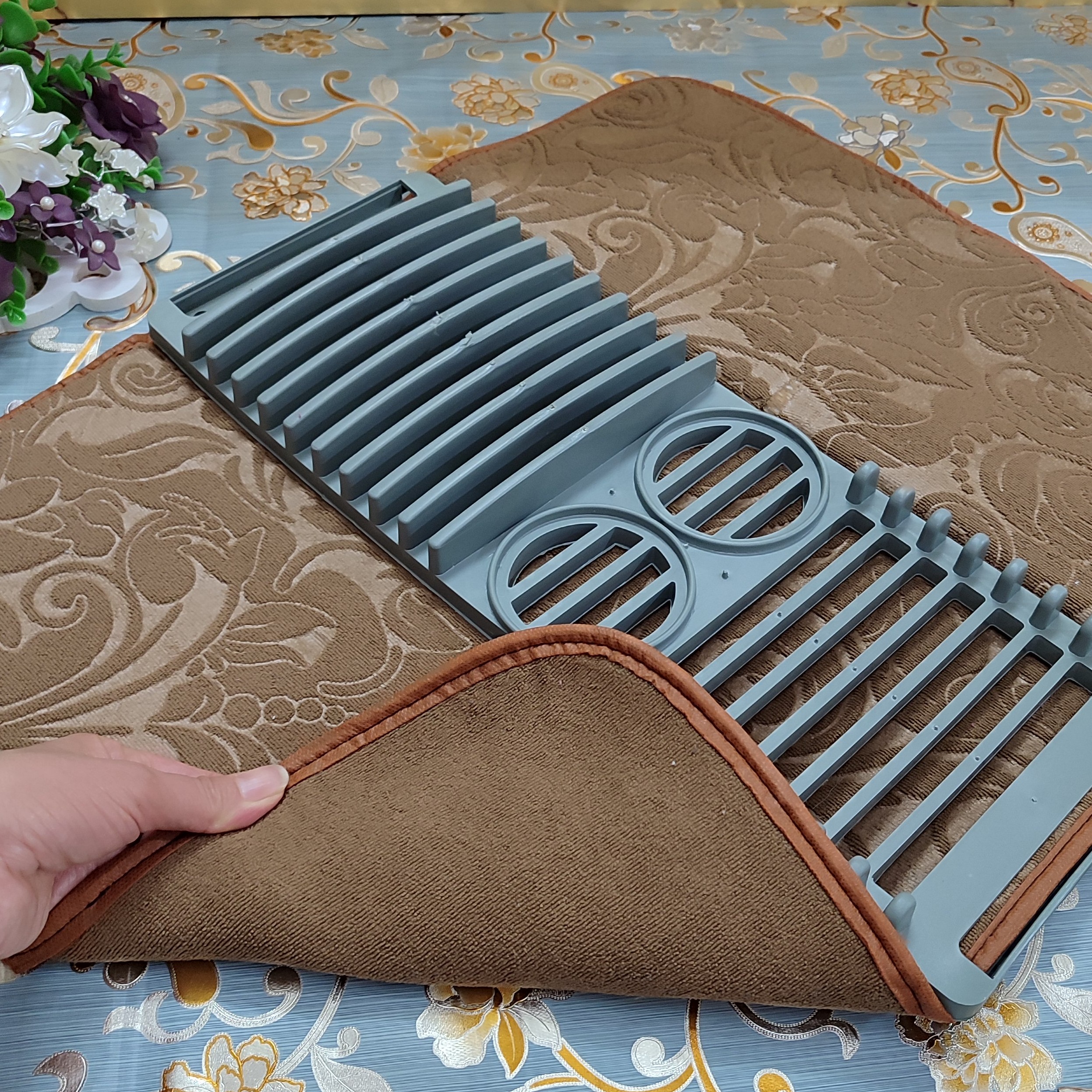 نمگیر جادویی فانتزی میکروفایبر استند دار خردلی رنگ پارچه حوله ای نانو طرح گل برجسته با قابلیت جذب آبگیری فوق العاده قابل شستشو