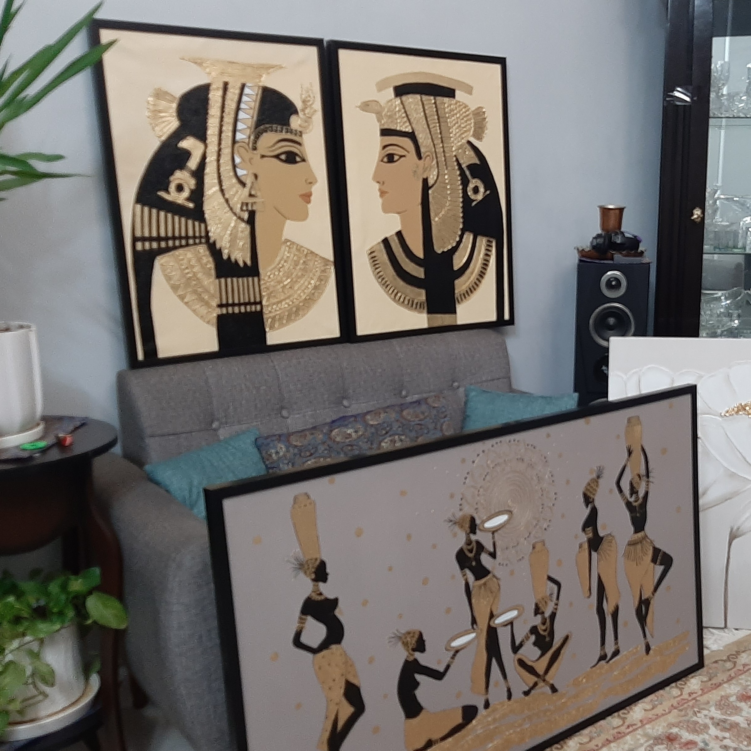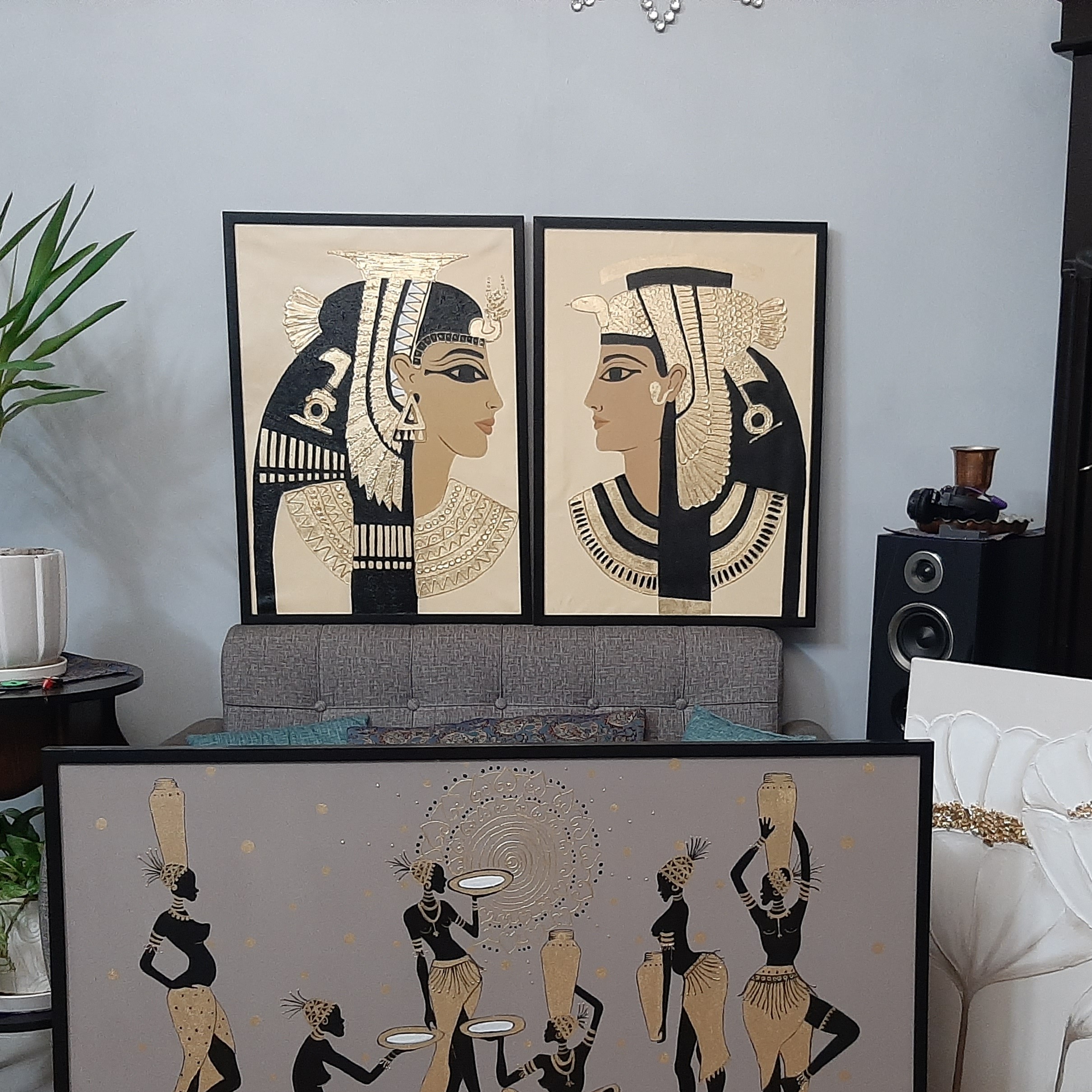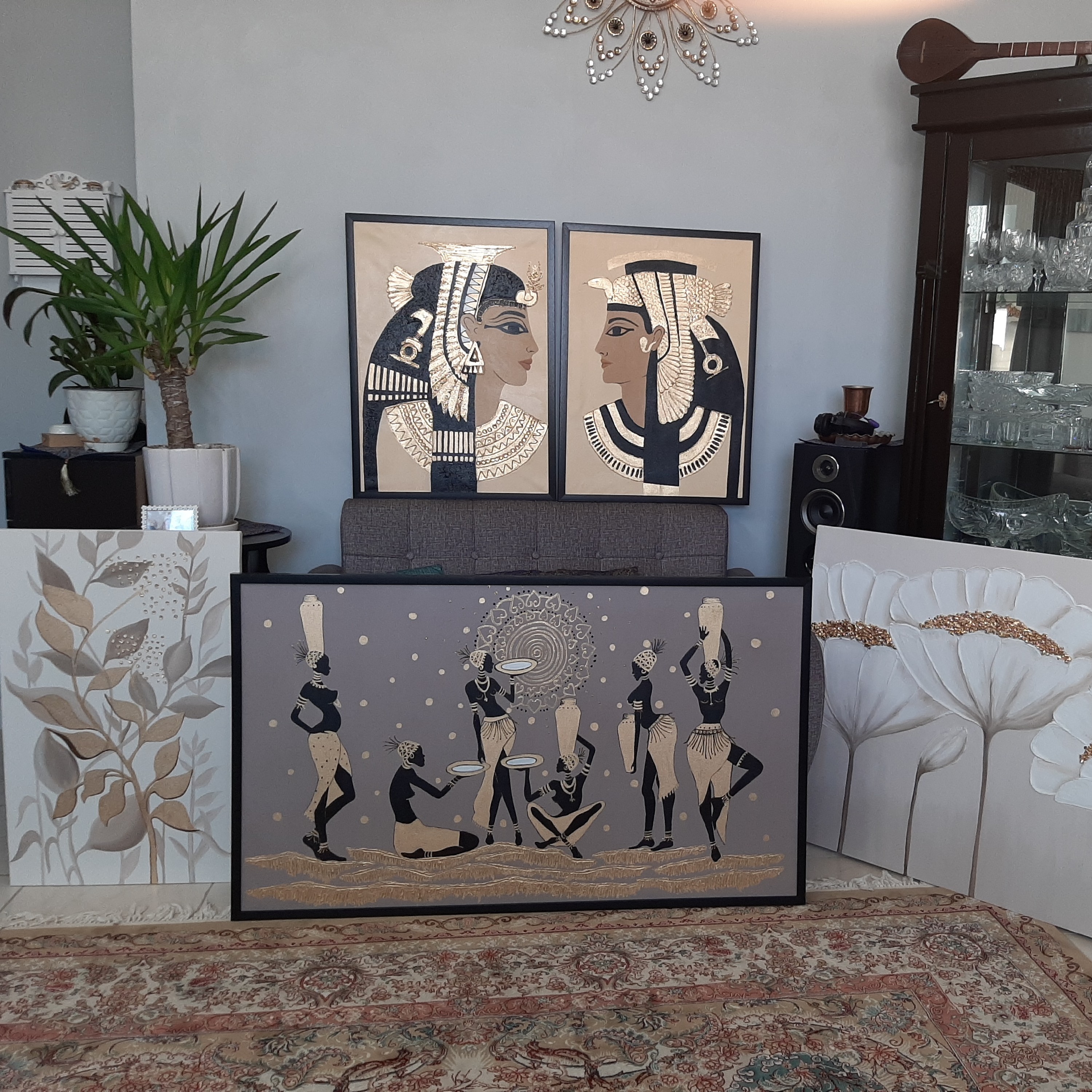 تابلو نقاشی زن و مرد مصری برجسته کار شده با ورق طلا و اکریلیک و خمیر تکسچر قیمت هر تکه میباشد شرایط برای همه تابلو ها هست مگر غیر از این ثبت شده باشد هزینه قاب جداست هزینه ارسال هست ممکن است ی مقدار تغییر در تابلو سفارشی شما وجود داشته باشد ک ب دلیل کیفیت عکس و کار دست بودن است اما تمیزی کار یکیست