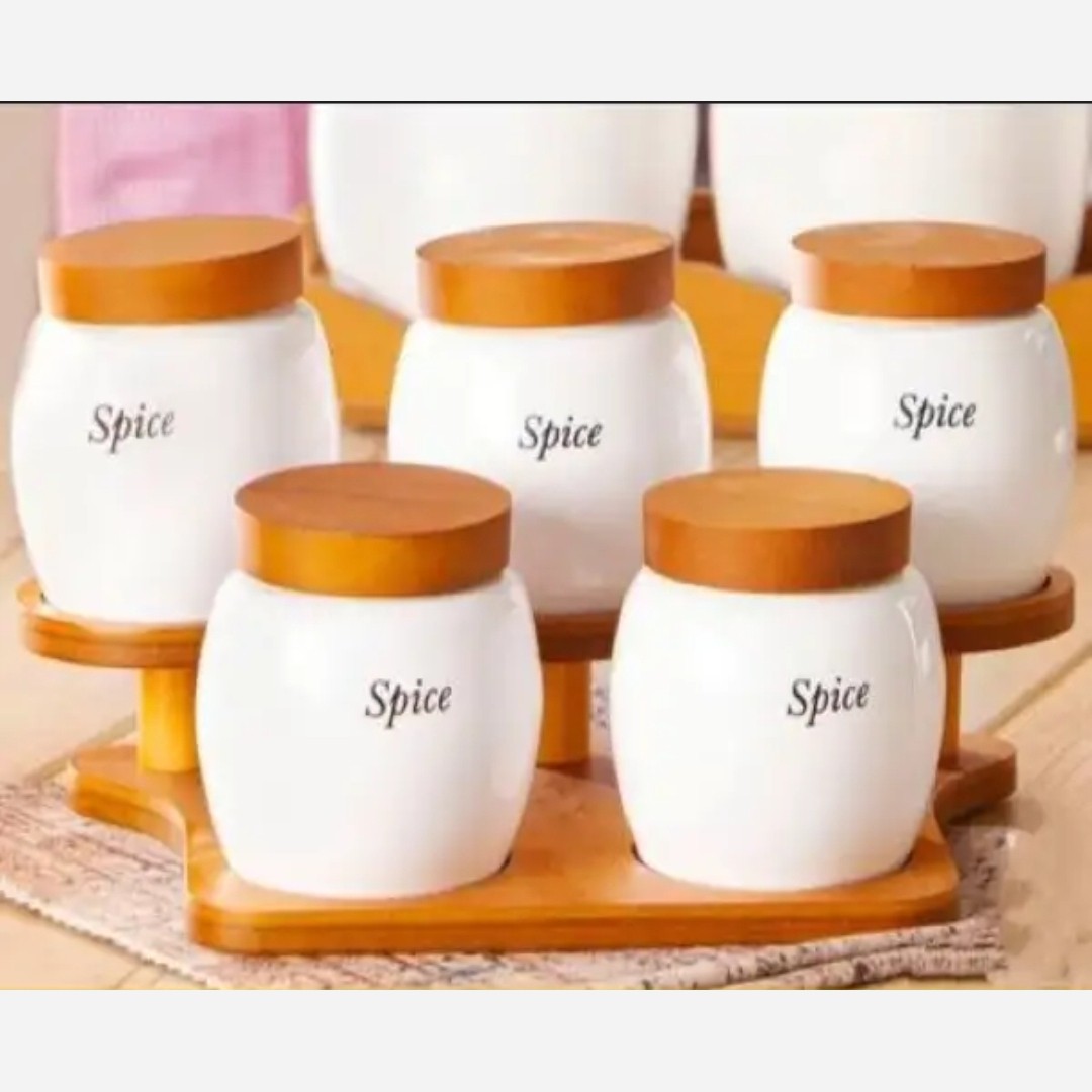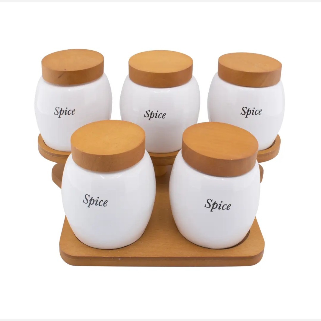 جا ادویه 5 پارچه نوع: استند دار سرامیکی چوبی جنس چوب بامبو و 100 درصد مقاوم در برابر آب بسیار زیبا و منحصر به فرد