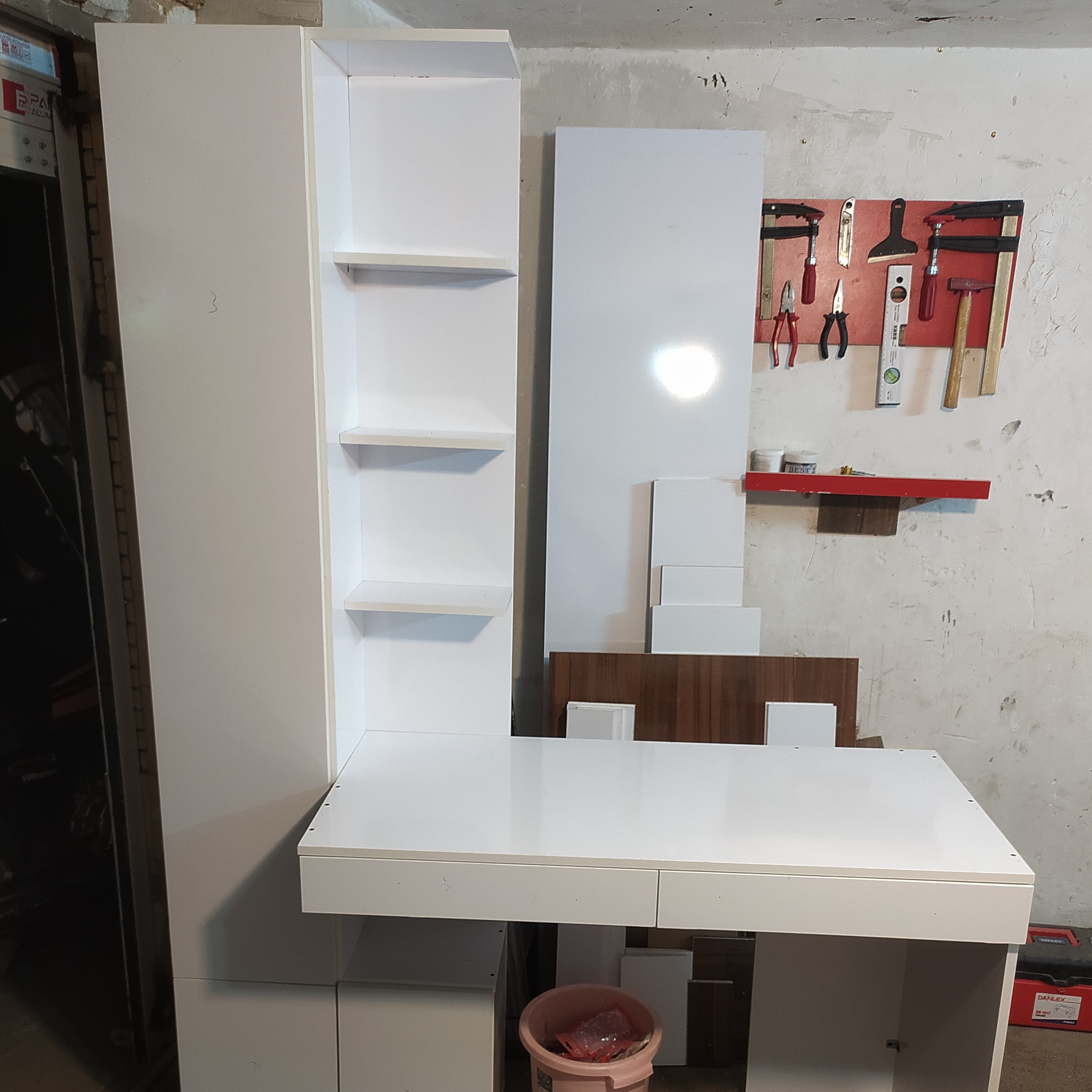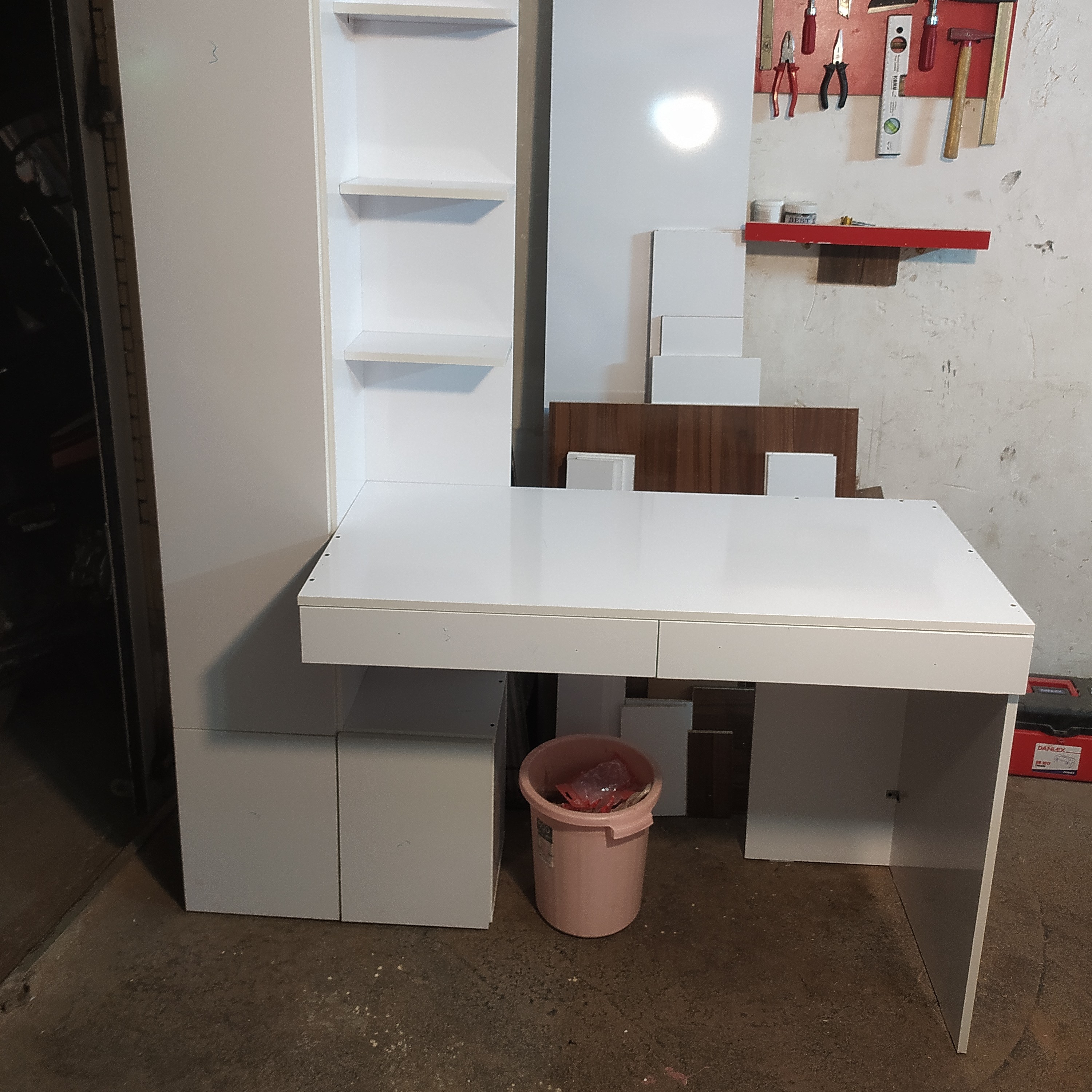 میز تحریر و کتابخانه سه درب و دو کشو یک درب بزرگ و دو درب کوچک در قسمت پایینی دو کشوی بزرگ و عمیق در زیر میز تمام درب ها و کشوها مگنت و به صورت فشاری هستش جنس MDF رنگ سفید ارتفاع 2 متر عرض کتابخانه 60 عمق 30 طول میز 100 عرض 40 ارتفاع 80 ارسال رایگان و ایمن بستهبندی ایمن و محکم ارسال در اسرع وقت