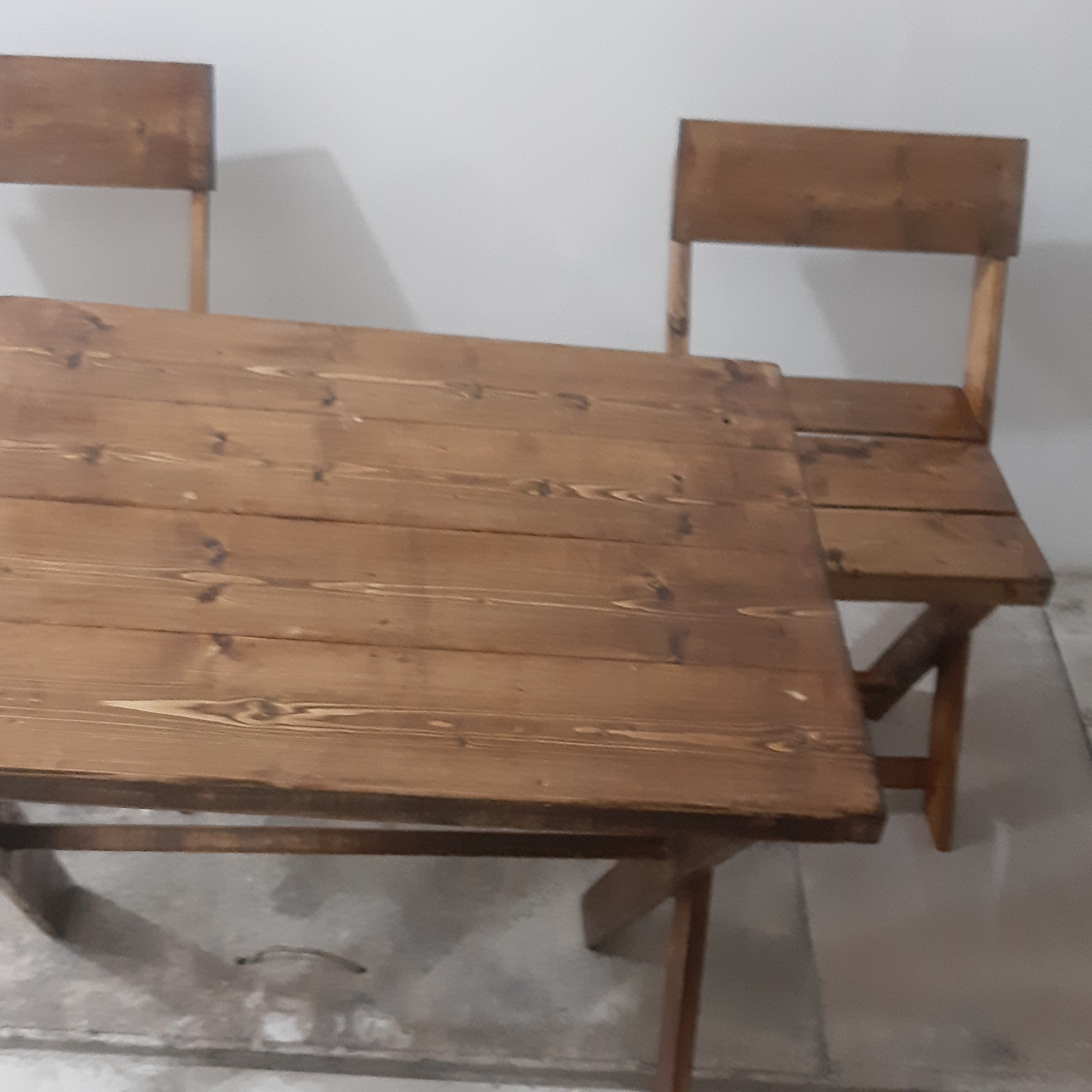 میز و صندلی تاشو با جنس چوب روس از چوب های 7×2 برای پایه محکم استفاده شده و کفی ها از چوب 1×14 روس ساخته شده. همین مدل را می شود با ضخامت کمتر ساخت تا هزینه کمتری داشته باشد سه دست رنگکاری شده.