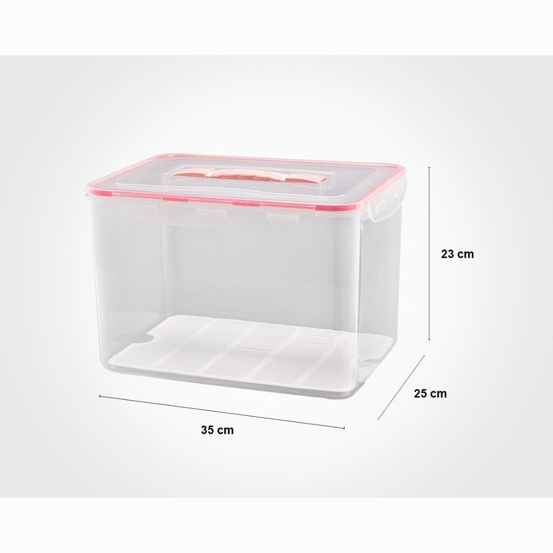 جنس: پلاستیک موجود در رنگهای: شفاف با دسته صورتی، وانیلی و طوسی ابعاد: طول 35 عرض 25 ارتفاع 23 سانتیمتر توجه: ابعاد با احتساب درب و قفل ها ذکر شده اند. ظرفیت: 14 لیتر مناسب برای نگهداری نان و میوه و سبزیجات دارای نوار سیلیکونی برای جلوگیری از تبادل هوایی که موجب محافظت مواد غذایی در برابر باکتری های هوازی میشود. دارای تحمل دمایی بین 20- تا 120+ درجه سانتیگراد قابل استفاده در یخچال و فریزر قابلیت شستشو در ماشین ظرفشویی