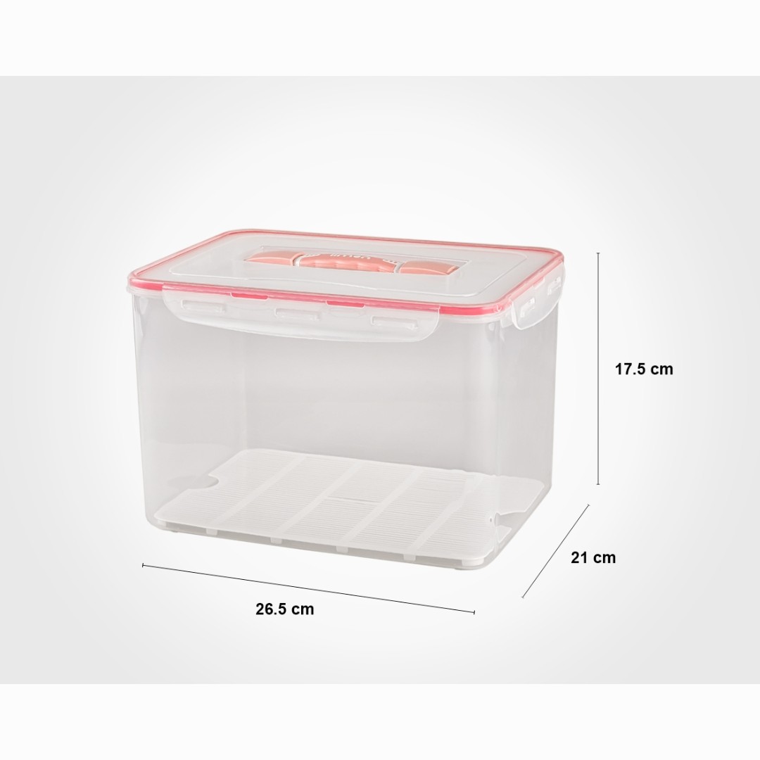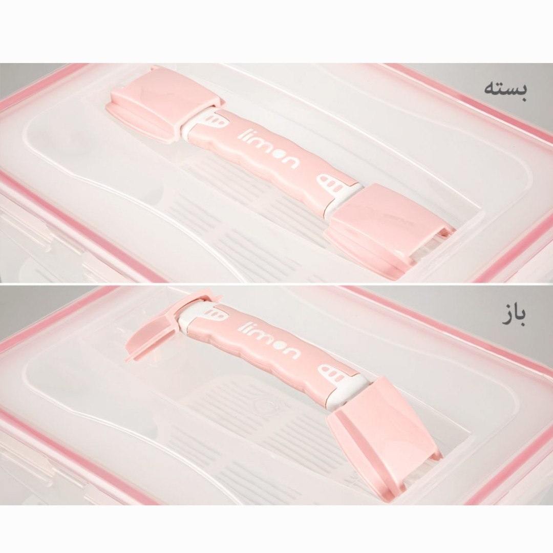 موجود در رنگهای: شفاف با دسته صورتی، وانیلی و طوسی ابعاد: طول 26.5 عرض 21 ارتفاع 17.5 سانتیمتر توجه: ابعاد با احتساب درب و قفل ها ذکر شده اند. ظرفیت: 7.5 لیتر مناسب برای نگهداری نان و میوه و سبزیجات دارای نوار سیلیکونی برای جلوگیری از تبادل هوایی که موجب محافظت مواد غذایی در برابر باکتری های هوازی میشود. دارای تحمل دمایی بین 20- تا 120+ درجه سانتیگراد قابل استفاده در یخچال و فریزر قابلیت شستشو در ماشین ظرفشویی