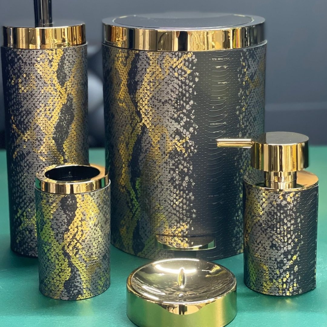 ست سرویس بهداشتی پنج پارچه لوکس چرمی مشکی طلا طرح پوست ماری برند بتیس مبلمونسرا مدل 266288