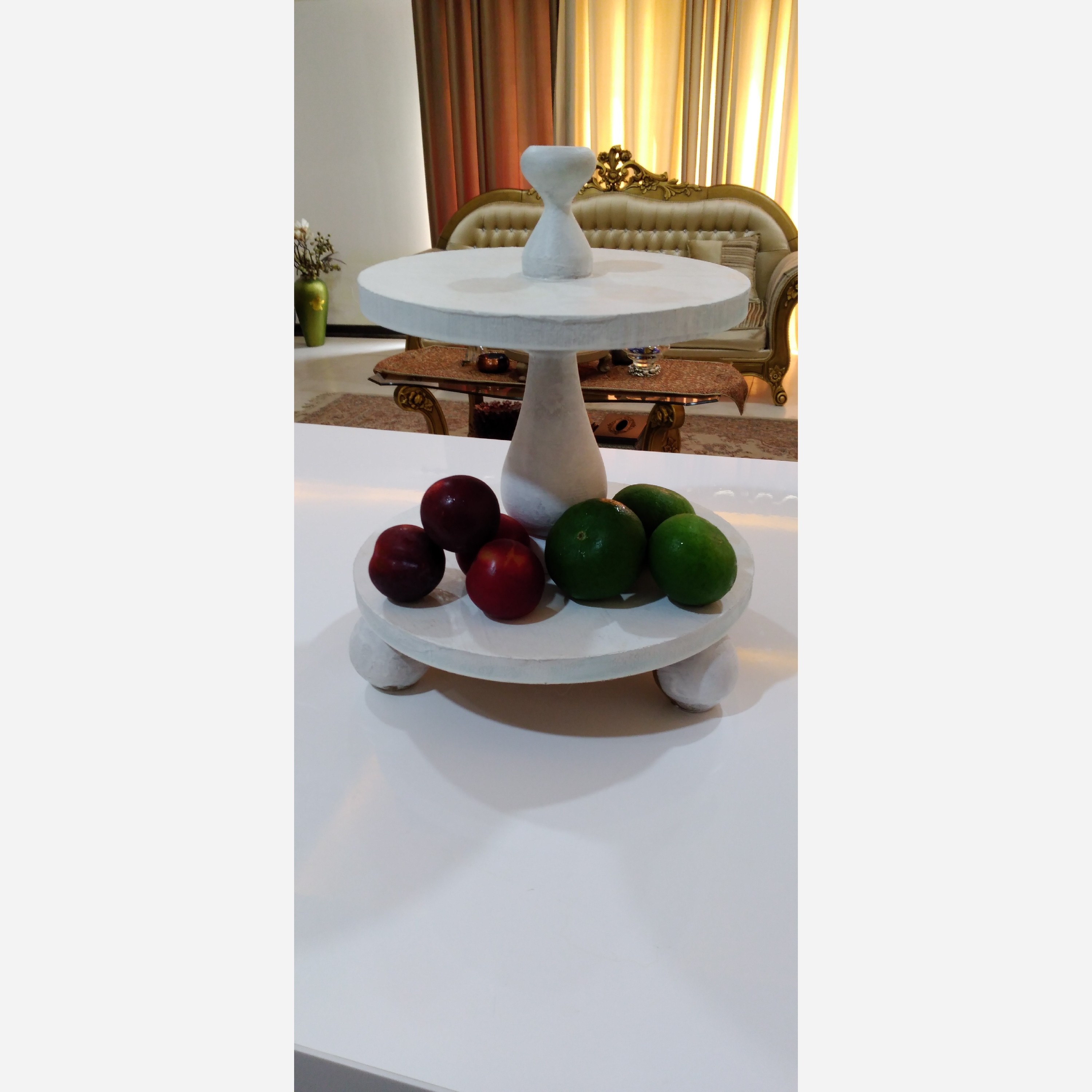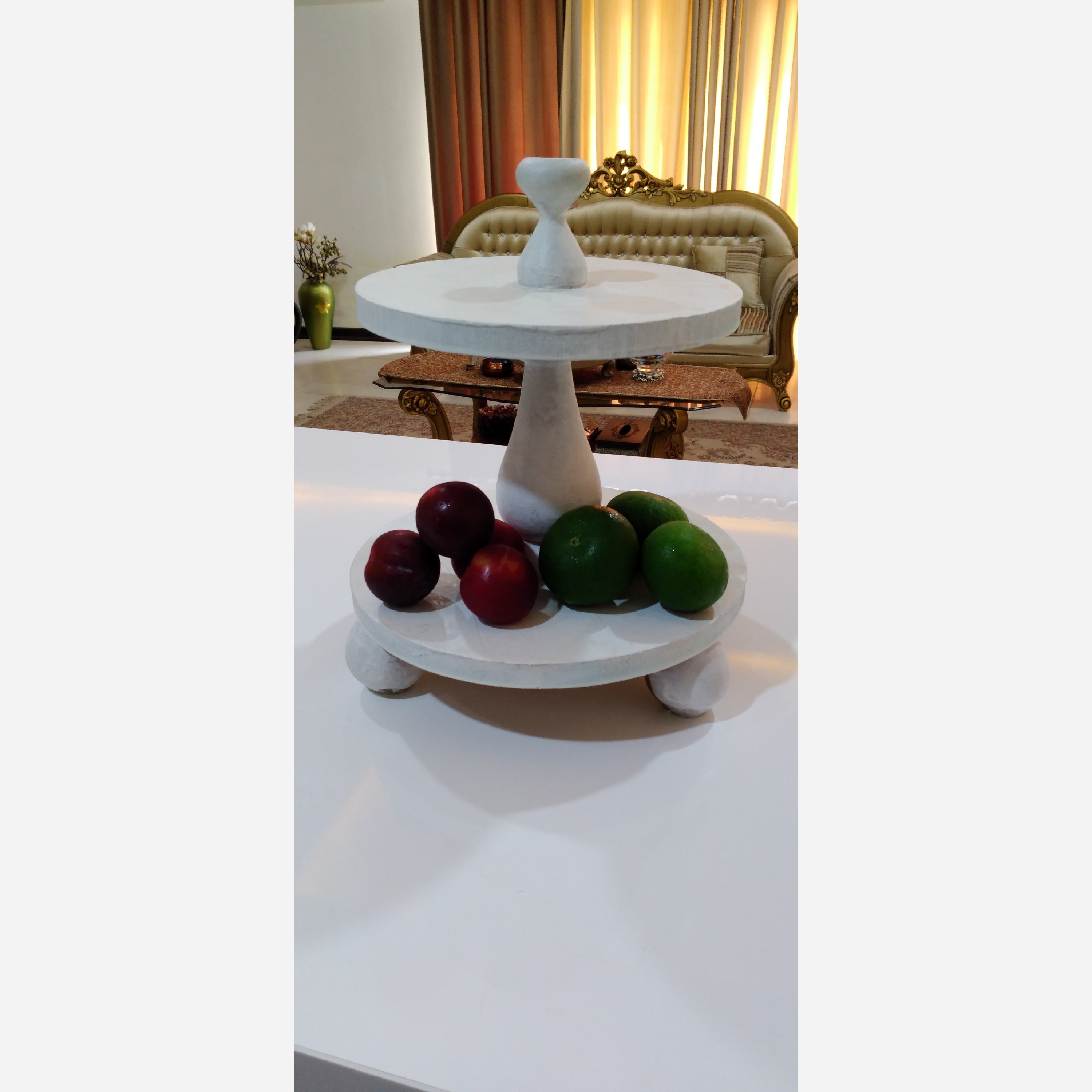 استند چوبی دو طبقه قطر صفحه پایین بیست و پنج و قطر صفحه بالا بیست و دو سانت و ارتفاع کل سی و سه سانت