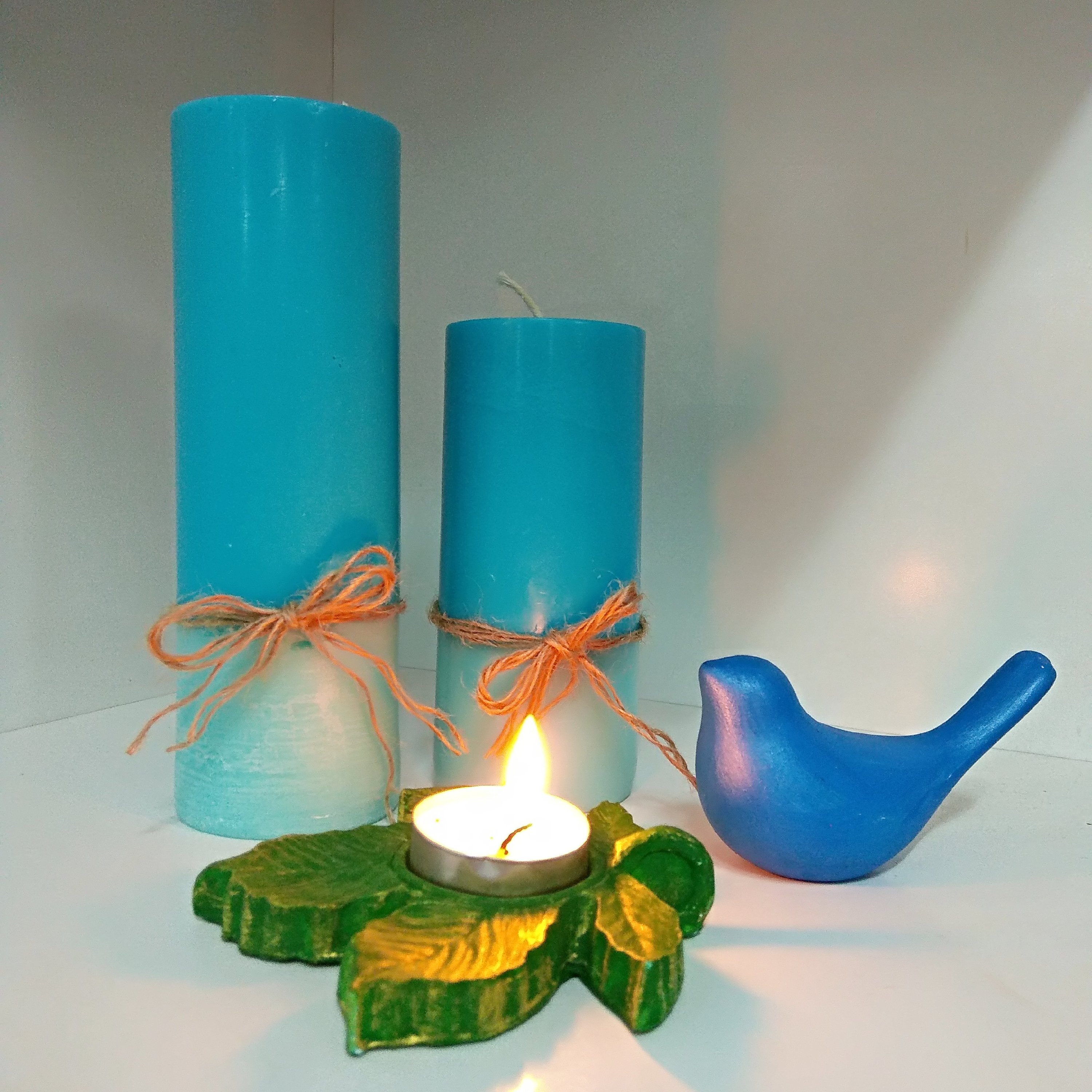 ست دو تایی شمع با ترکیب رنگ آبی آسمانی کمرنگ و پررنگ چشم نواز و زیبا برای ایجاد محیط صمیمی و آرامشبخش