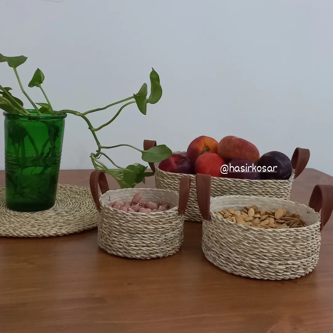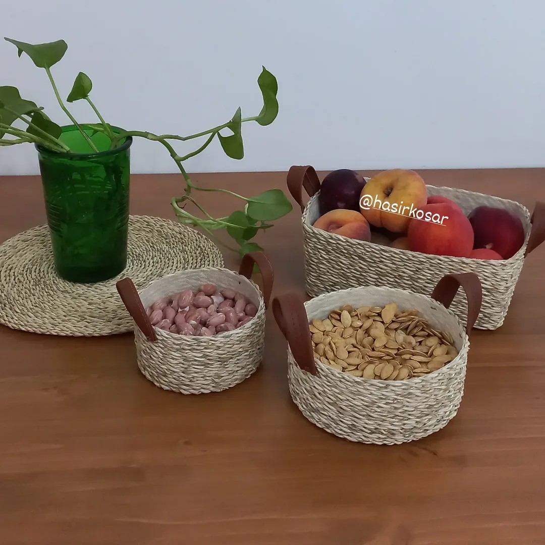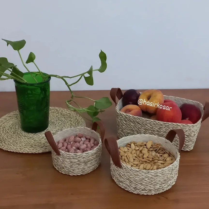 سبد شکلات وآجیل حصیری گرد دسته چرمی مبلمونسرا مدل 278804