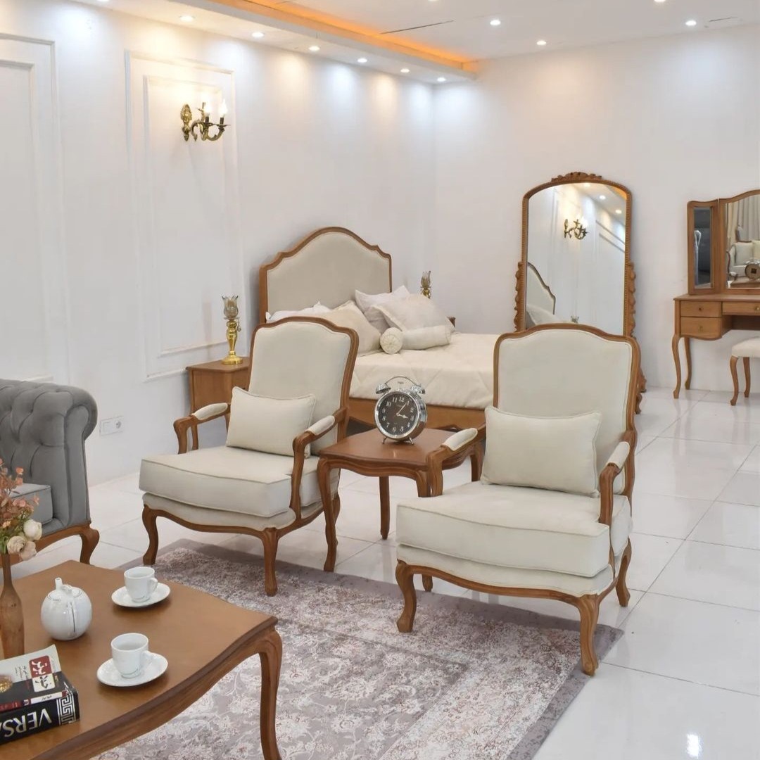 مدل کویین فرانسوی ⚜️کاناپه سه نفره تاج انحنا+چستر کویین+دو عددمبل کویین فرانسوی+جلو مبلی عسلی همراه با ⚜️ناهارخوری ۶