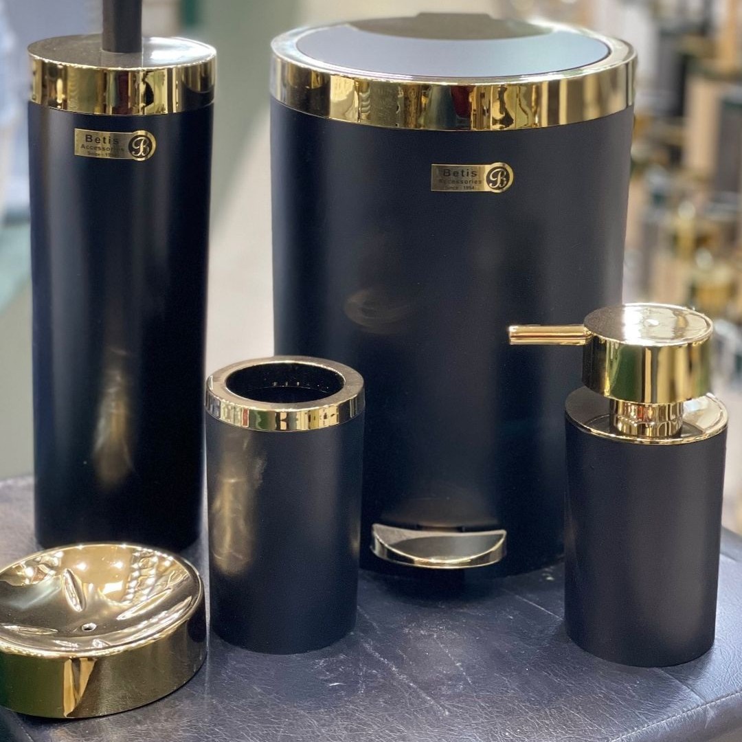 ست شش پارچه مشکی طلایی بتیس مدل شاین طرح جدید شامل : سطل برس جامایع جاصابون جامسواک جادستمال درب سطل هم به صورت باد بزنی هم پدالی در این پست رنگ جادستمال تمام طلایی میباشد