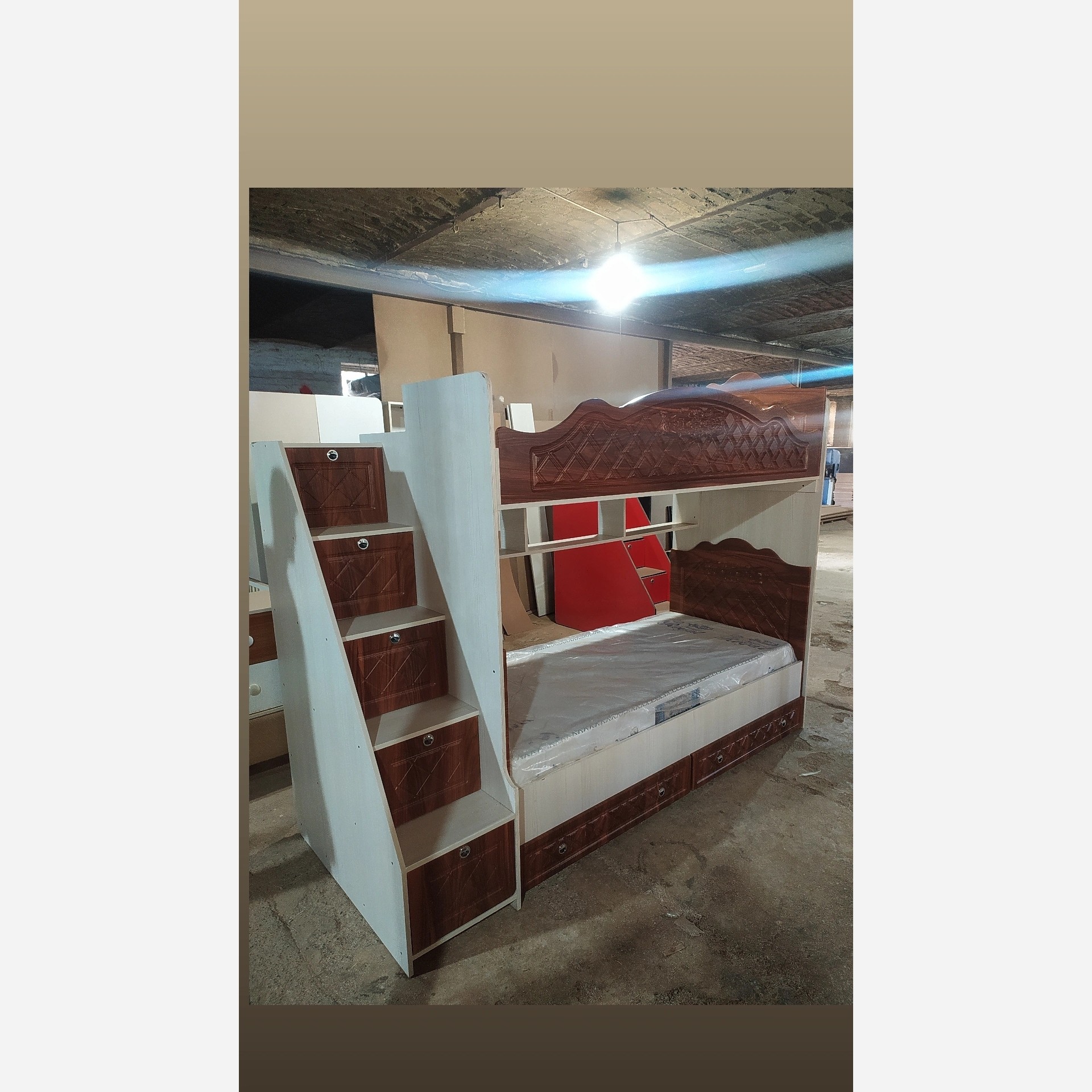هزینه حمل و بسته بندی به عهده مشتری میباشد تخت دوطبقه پله منبری90×200 پله های باکسی بزرگ و جادار بدنه ملامینه پویا نما ام دی اف ممبران کتابخانه زیر تخت بالا دوکشو زیر تخت