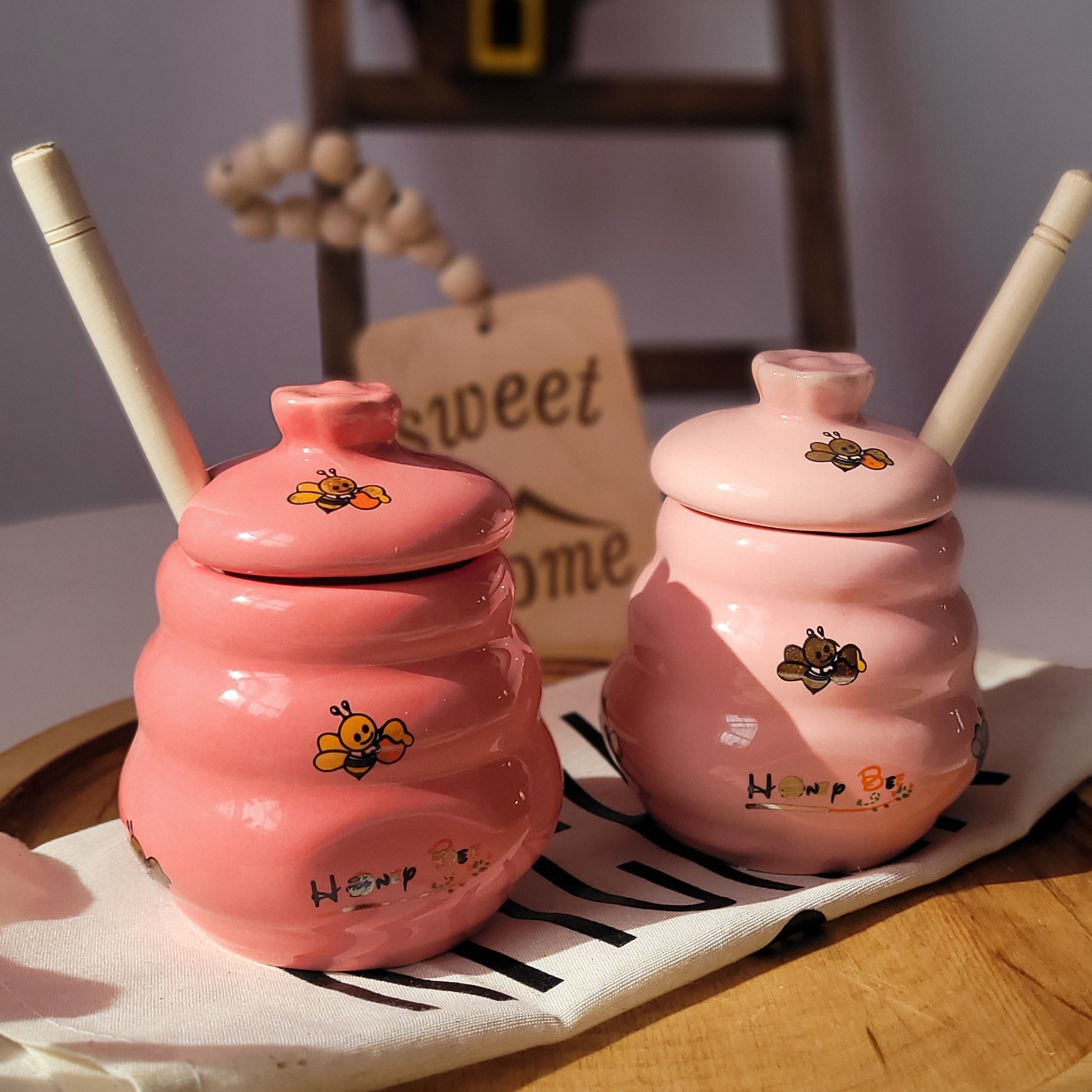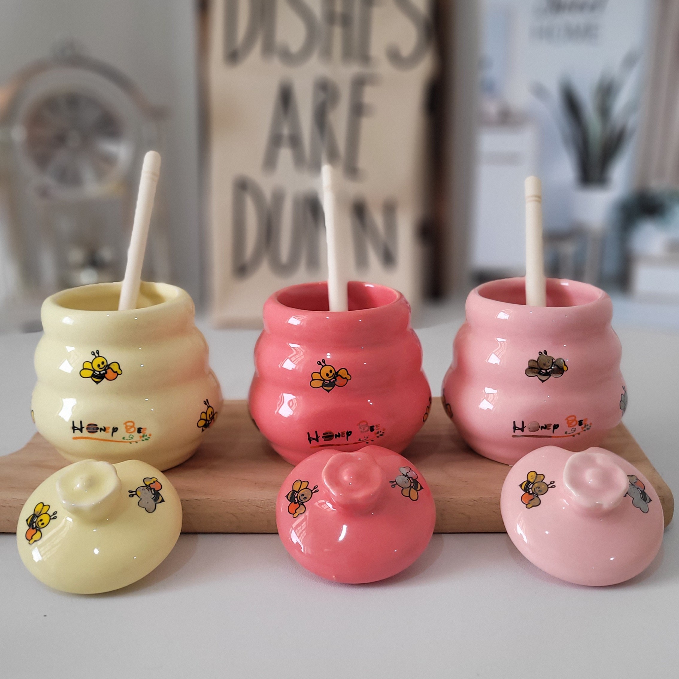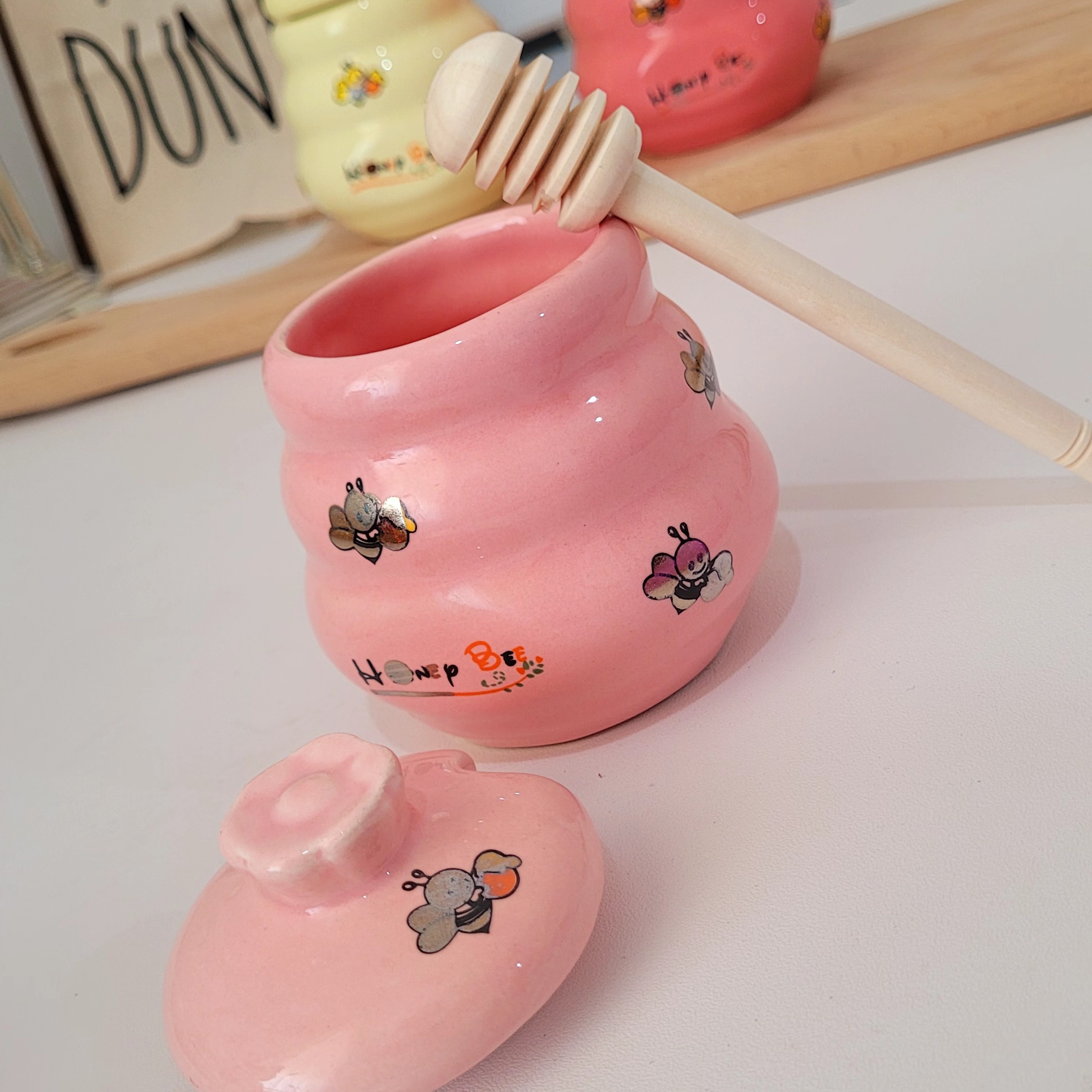 عسل خوری کندو زنبور از جنس سرامیک رنگی طراحی شده به شکل کندو زنبور بدنه تزئین شده با طرح زنبور همراه با قاشق عسل خوری مناسب برای نگهداری و سرو عسل و ارده شیره قابل استفاده برای سرو و پذیرایی در منزل، هتلها