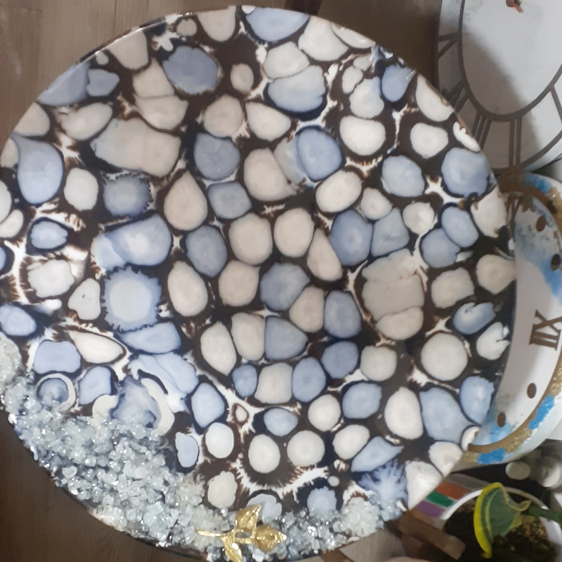میز رزینی شیک سنگ کاری شده به قطر ۵۵ از جنس چوب که با رزین کاور شده با پایه های چوبی نراد
