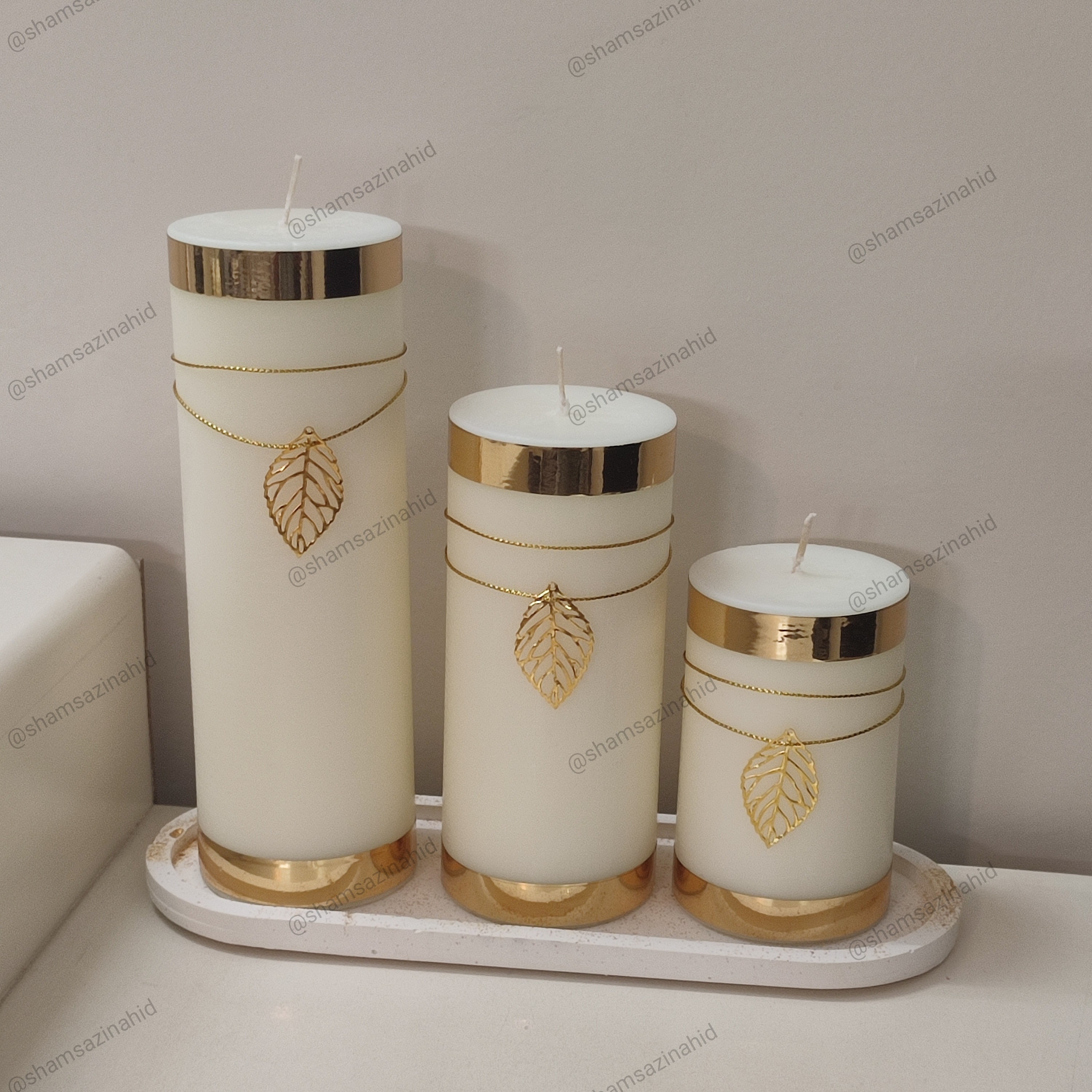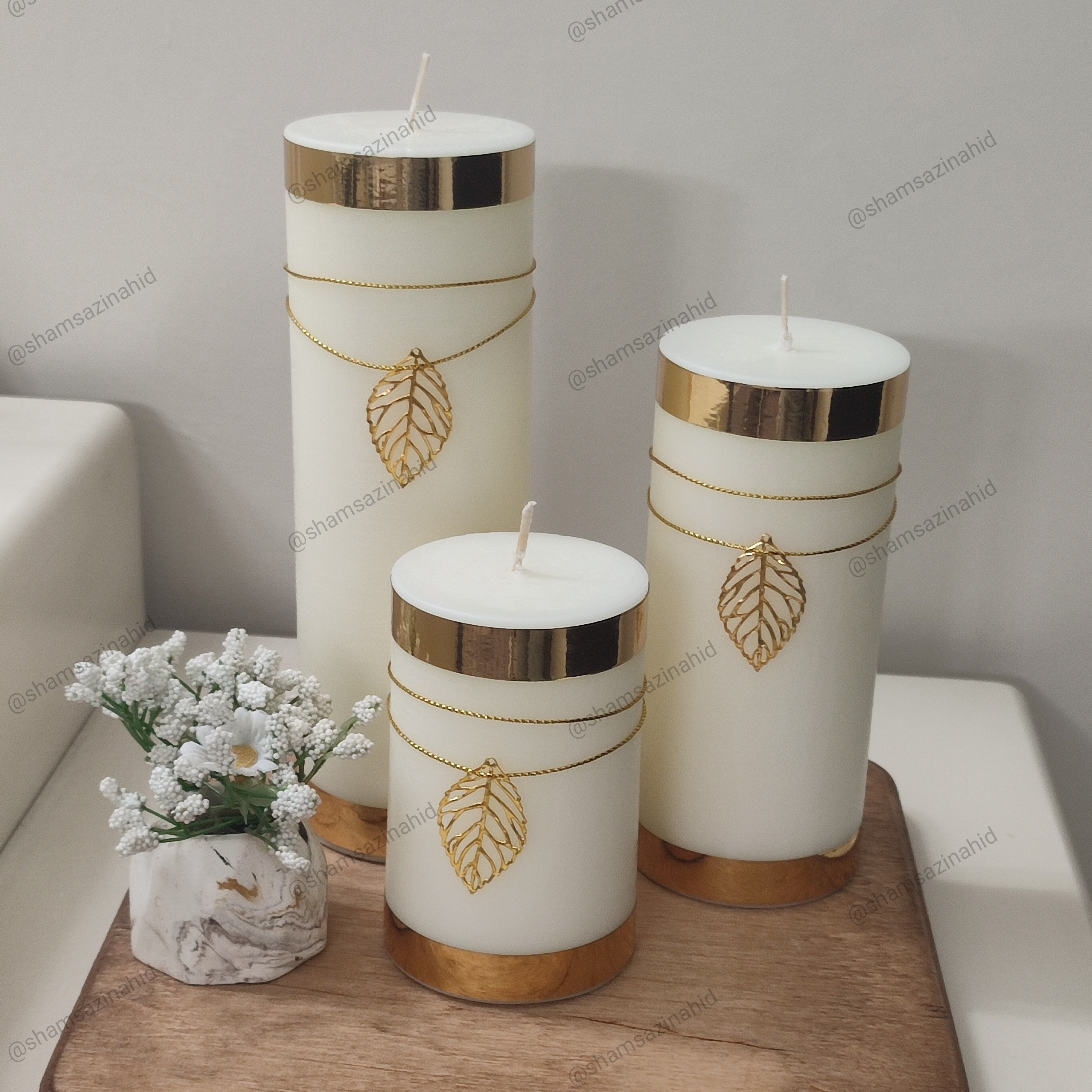 شمع استوانه برگی سه عددی طلایی مبلمونسرا مدل 279564