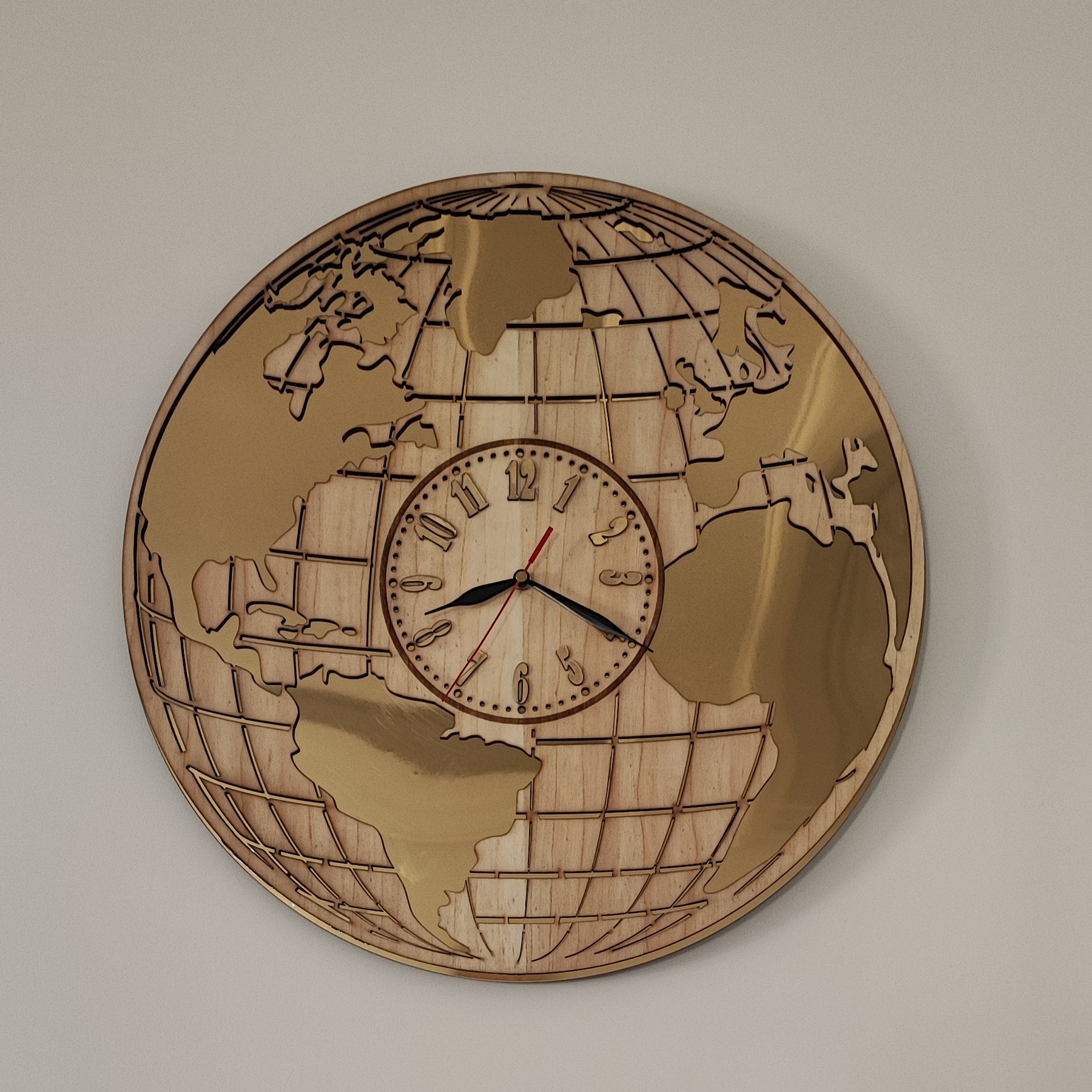 ساعت دیواری چوبی طرح سه بعدی برجسته کره زمین ترکیب چوب ومولتی استایل طلایی آینه ای در سه سایز 50 و 60 و 100 سانت مبلمونسرا مدل 237061