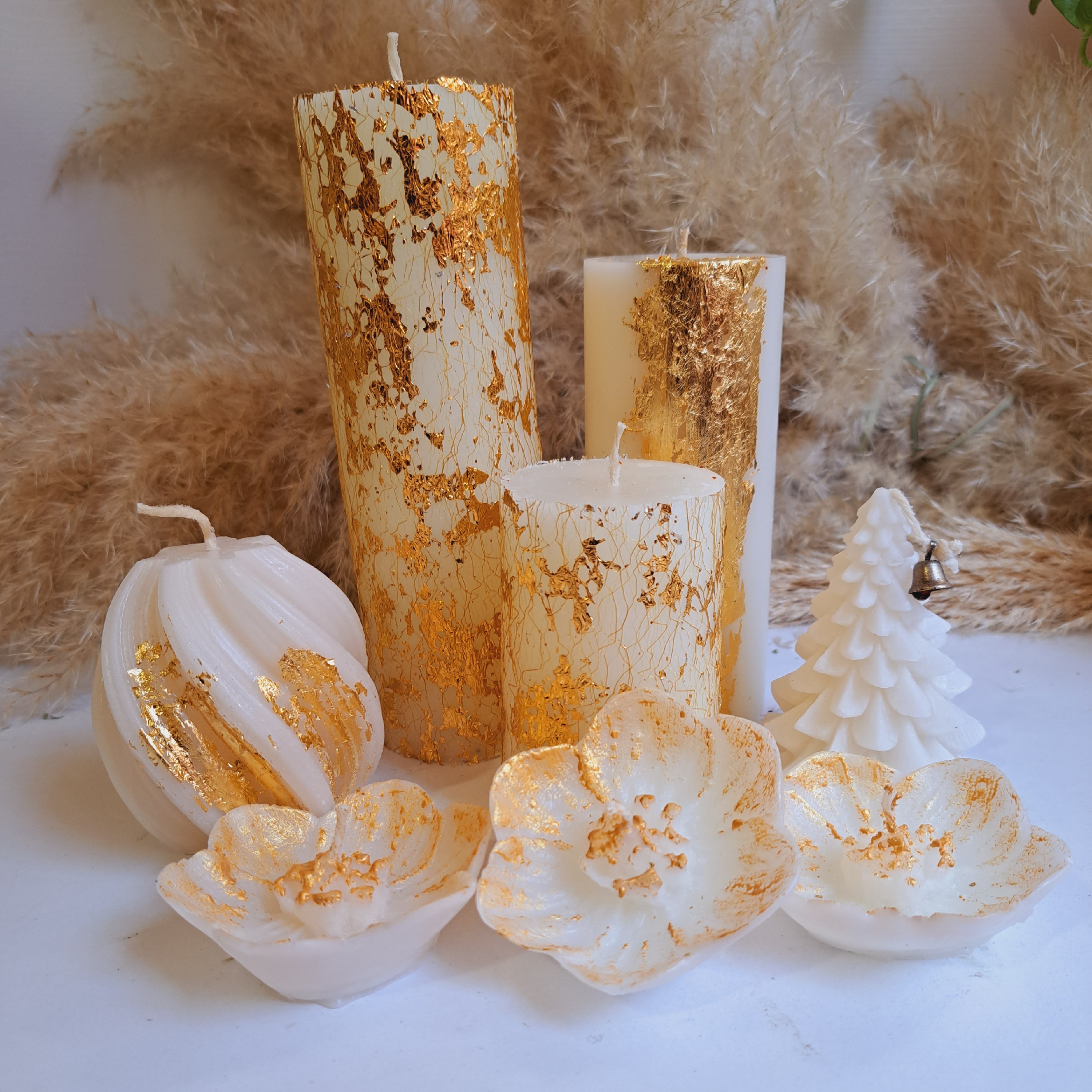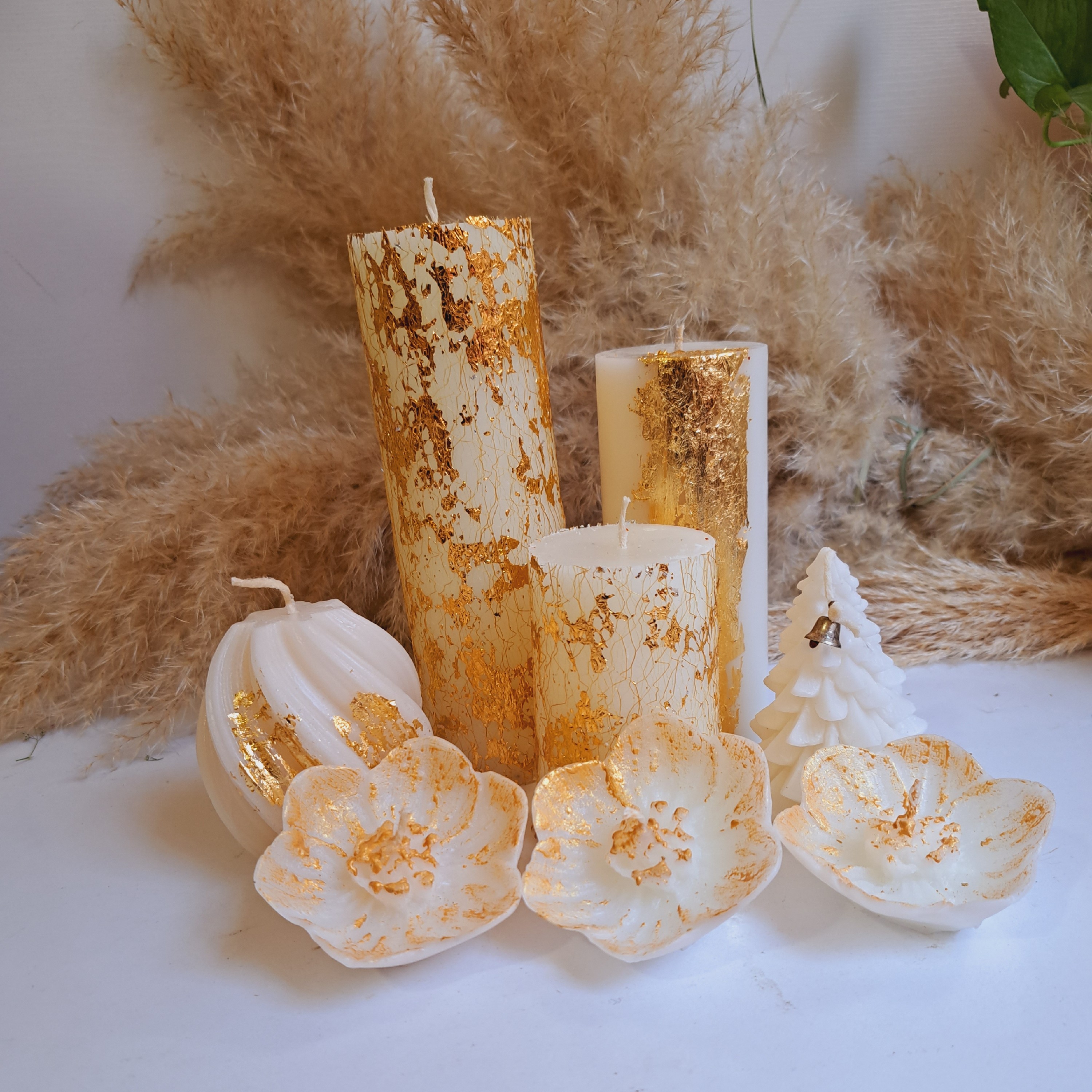 شمع های زیبای ست مناسب برای هدیه دادن و دیزاین منازل ۸ تیکه میباشد شامل ست استوانه سه گل کاج و گوی دریا
