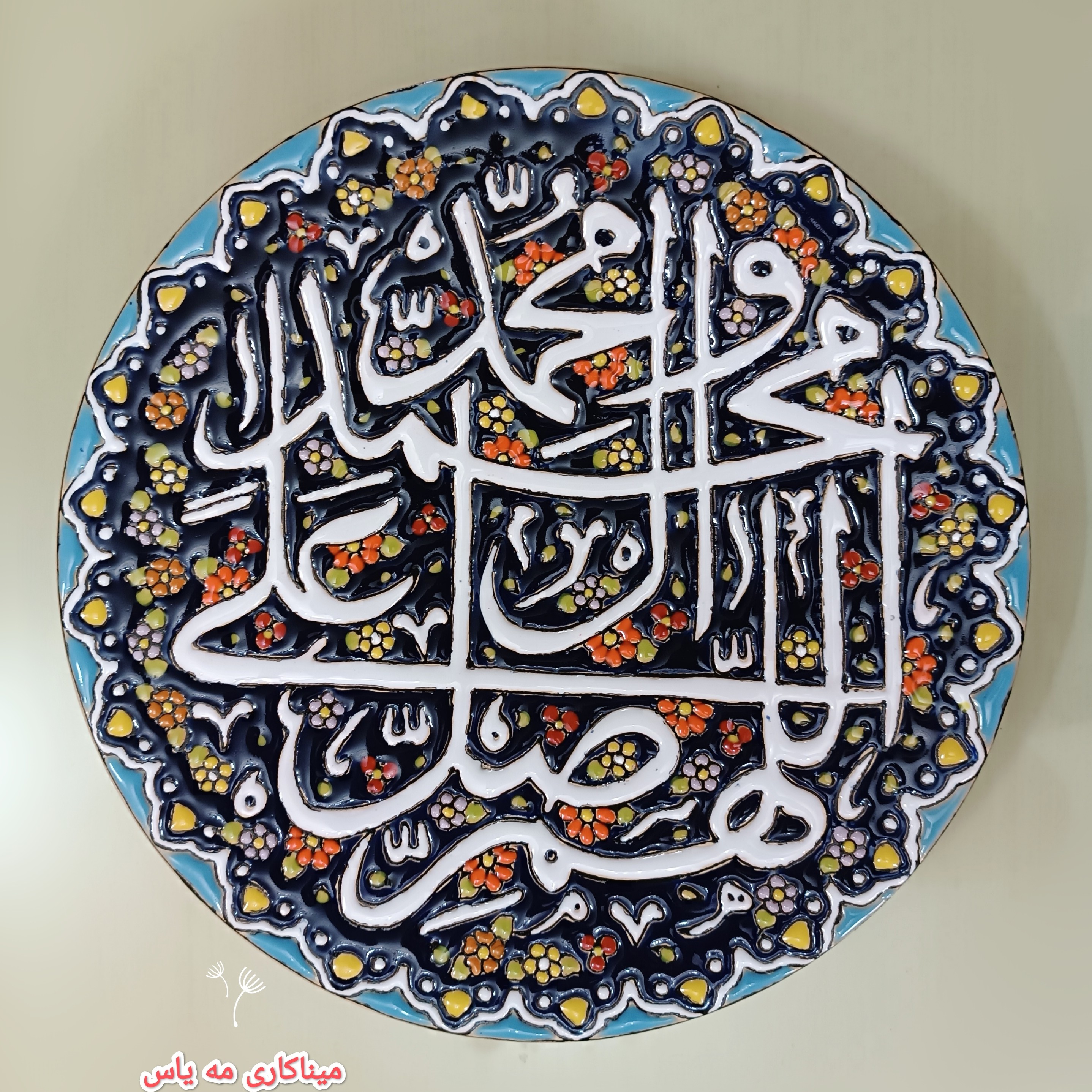 بشقاب دکوری دیوار کوب 🔸 سایز ۲۵ سانت 🔸منقش به آیه مقدس صلوات 🔸 قابل اجرا در طرح ها و رنگ های مختلف طبق سلیقه شما 🔸 موجود و آماده تحویل 🔸 زمینه سورمه ای 🔸🔸🔸🔸🔸🔸🔸