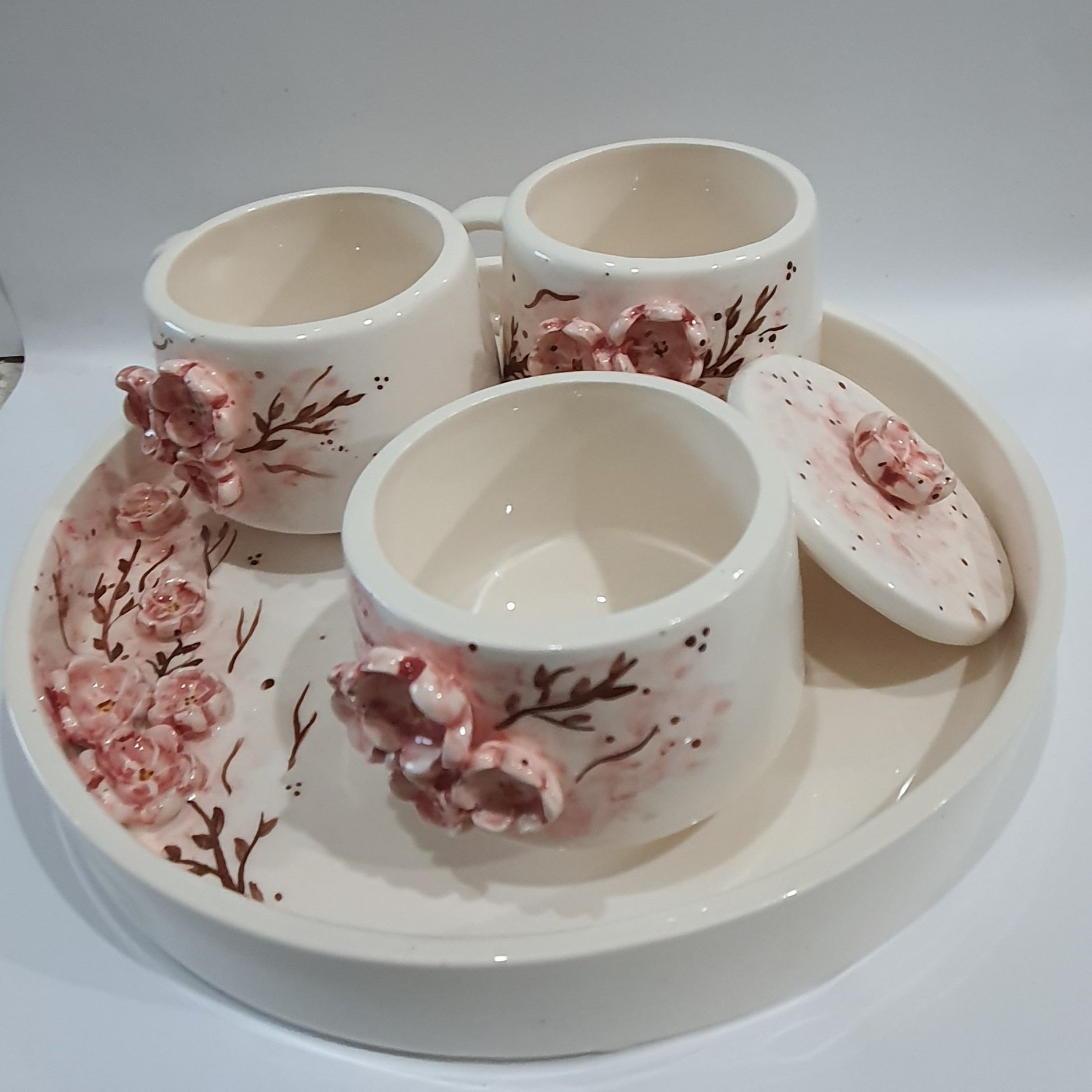 ست چای خوری دو نفره گل برجسته صورتی طرح و رنگ قابل تغییر می باشد قابل استفاده در فر و ماکروویو و ماشین ظرفشویی پخته شده در دمای ۱۱۱۰